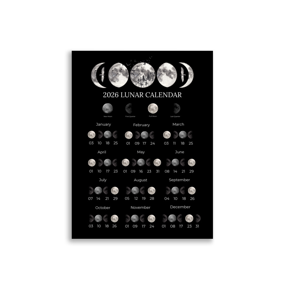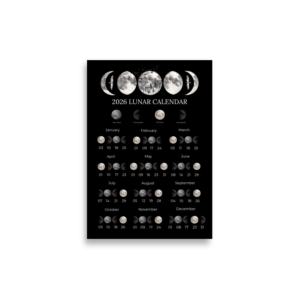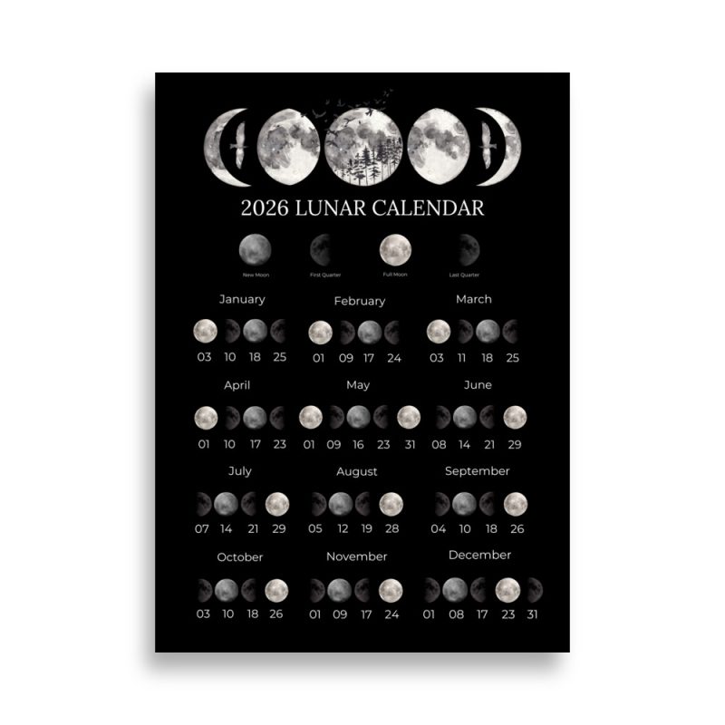 Poster dekorerad med månens kalender för 2026. Denna poster finns i fem olika storlekar och är tillverkad i ett kraftigt kvalitetspapper. Kommer garanterat dra blickarna till sig i ditt hem.