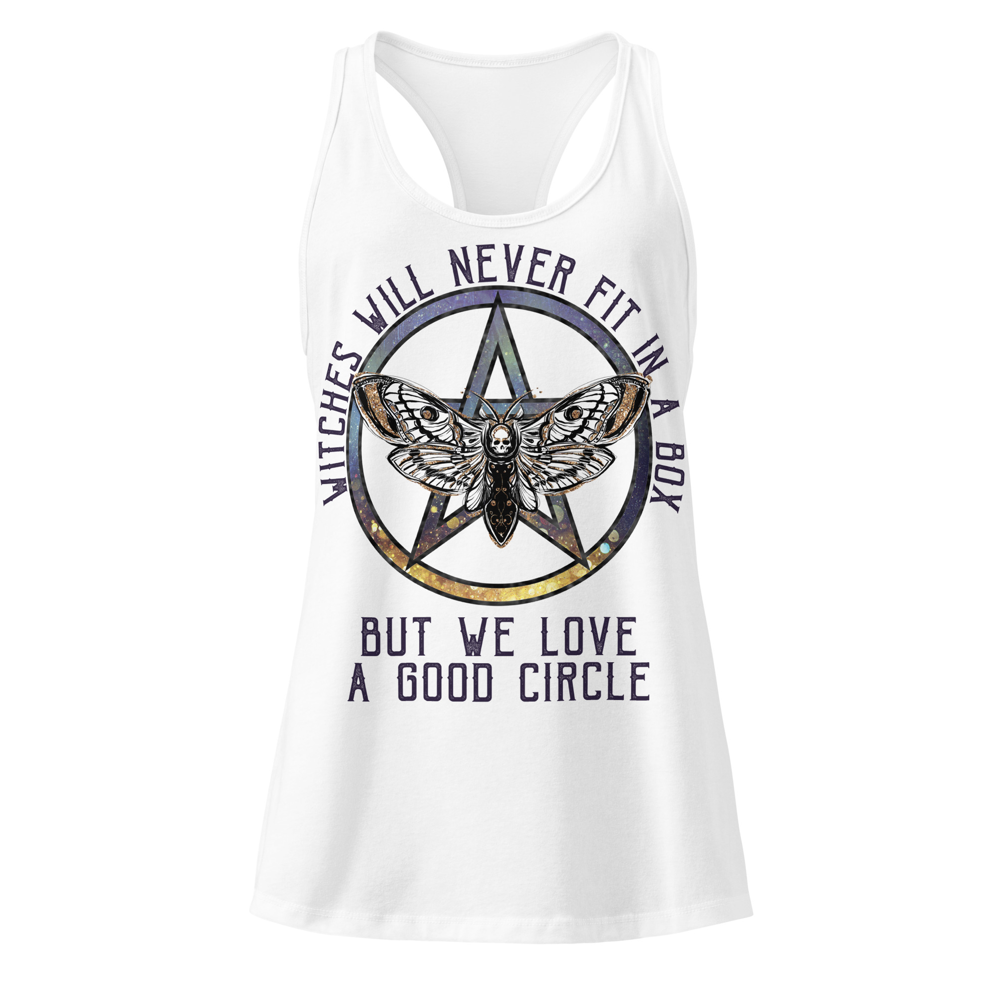 Snyggt linne i racerback-modell med ett pentagram med en dödskallemal och texten ’Witches will never fit in a box, but we love a good circle’ som dekoration på framsidan. Linnet är tillverkat i jersey i lättvikt för att följa kroppen perfekt. Materialet är mycket stretchigt och kommer bli din nya favorit.