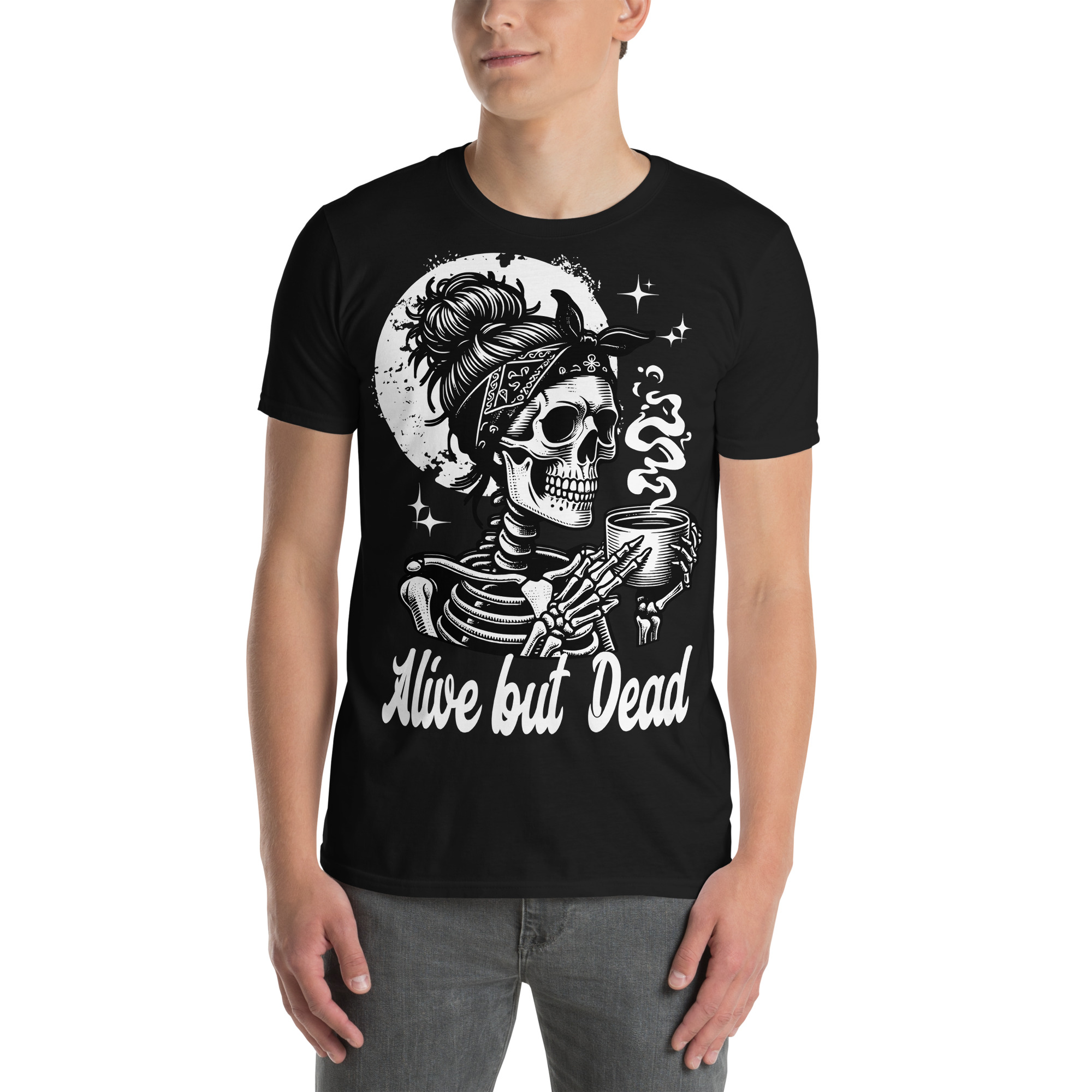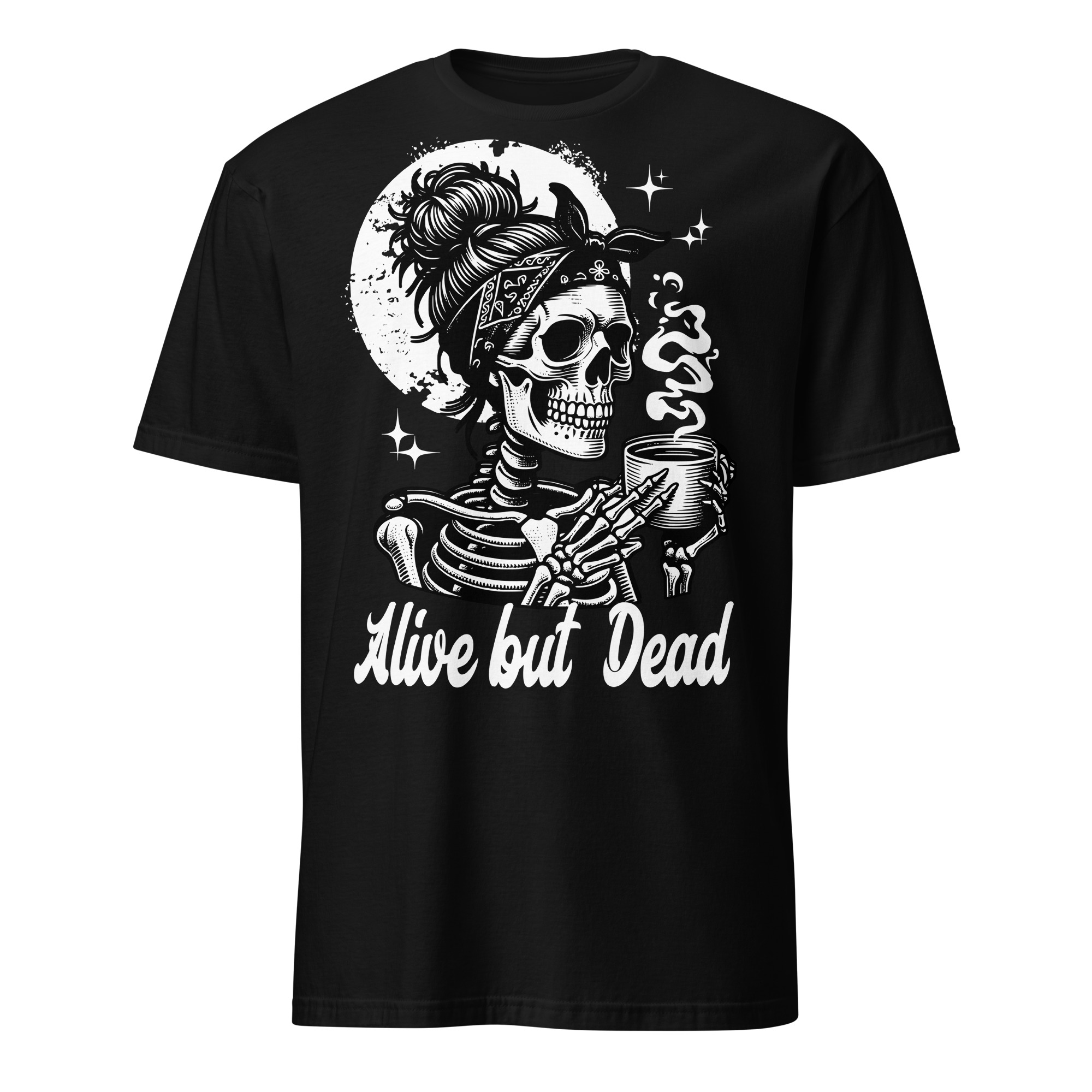 T-shirt i svart med ett kvinnligt skelett som dricker kaffe och texten ’Alive but dead’ som dekoration på framsidan. Passar perfekt till alla som behöver kaffe för att överleva. Tröjan är tillverkad i en supermjuk kvalitet i 100% bomull.