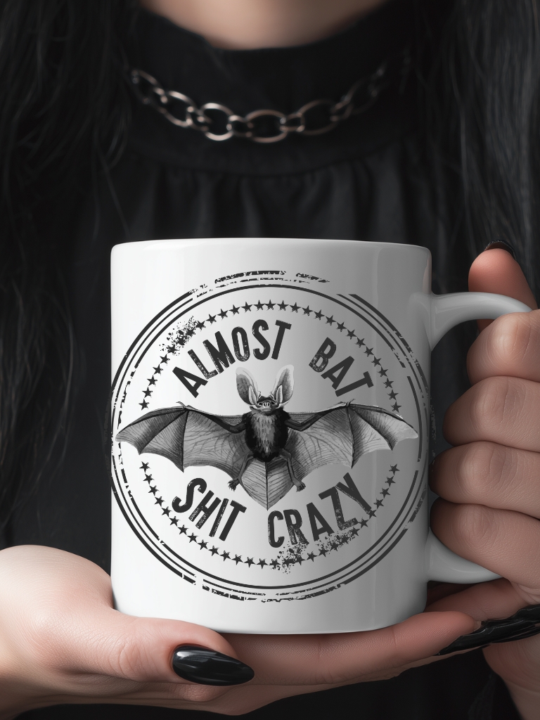 Mugg i vitt med en fladdermus och texten ’Almost bat shit crazy’ som tryck på båda sidorna. Muggen är tillverkad i keramik och tål både maskindisk och uppvärmning i mikrovågsugn. Blir en perfekt mugg på jobbet för att visa dina arbetskollegor att du är näst intill galen.