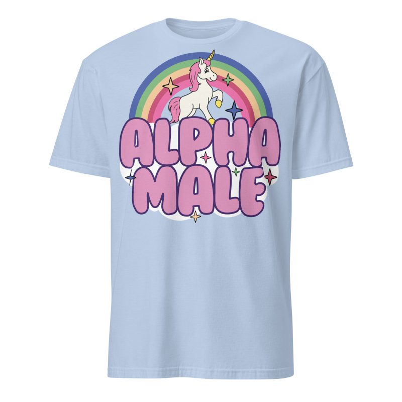 T-shirt i ljusblått med en stor enhörning och texten ’Alpha male’ som dekoration på framsidan. Passar perfekt till alla alfahannar. Tröjan är tillverkad i en supermjuk kvalitet i 100% bomull.