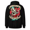 Hoodie i unisex-modell tillverkad i en extra fin kvalitet i blandad bomull och polyester. På baksidan återfinns en doktor som håller upp ett äpple och texten ’An apple a day, you die anyway’ som dekoration. Hoodien håller värmen riktigt bra och har ett otroligt mjukt tyg.
