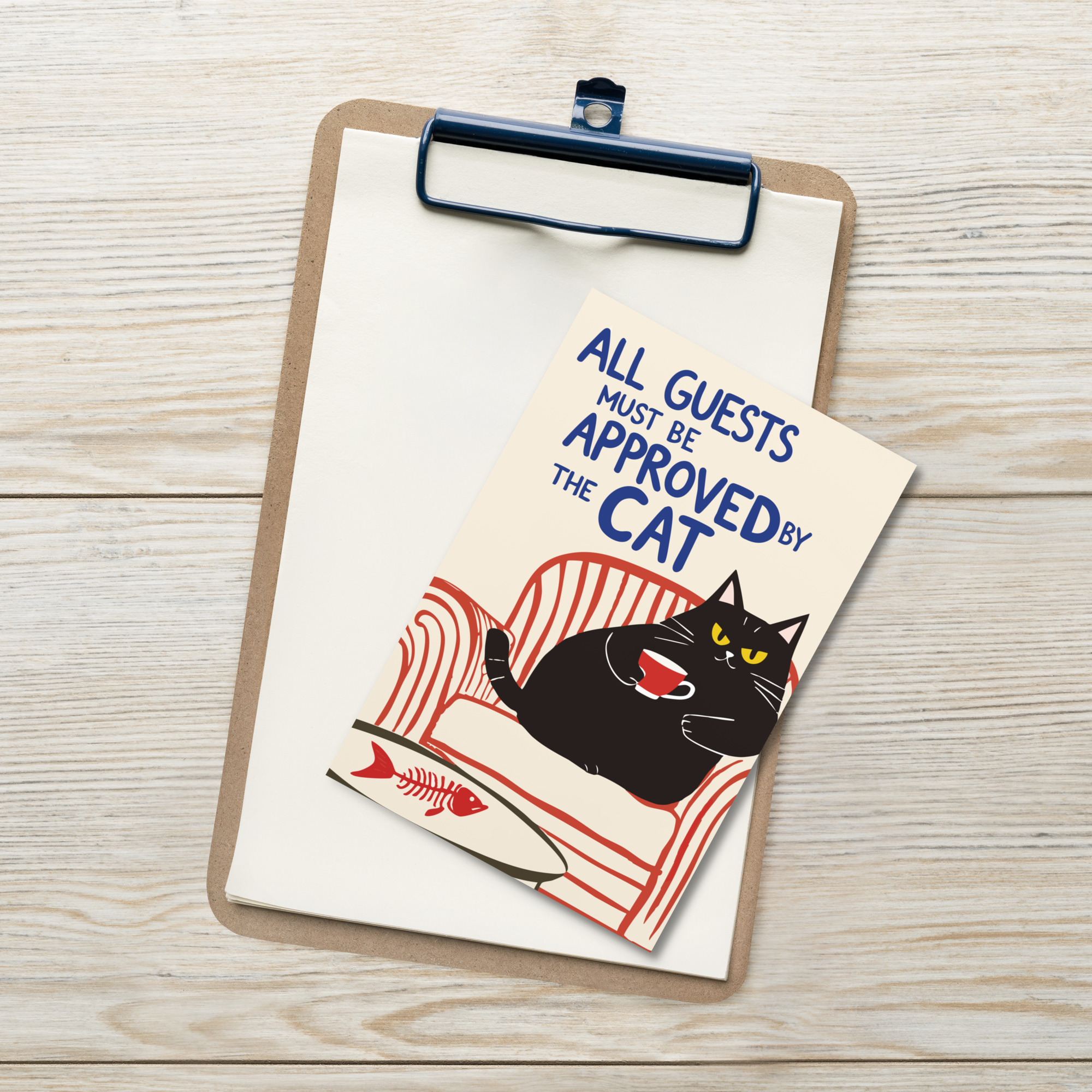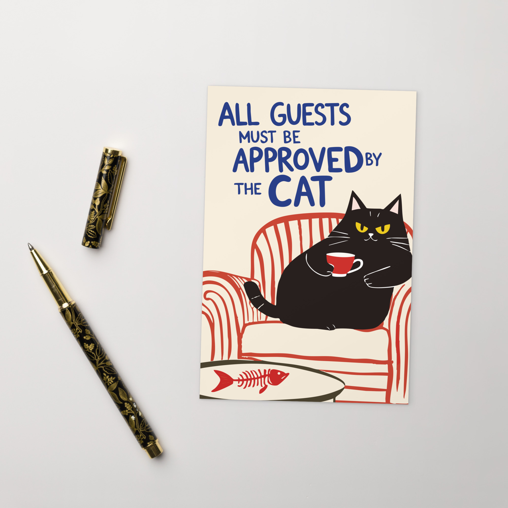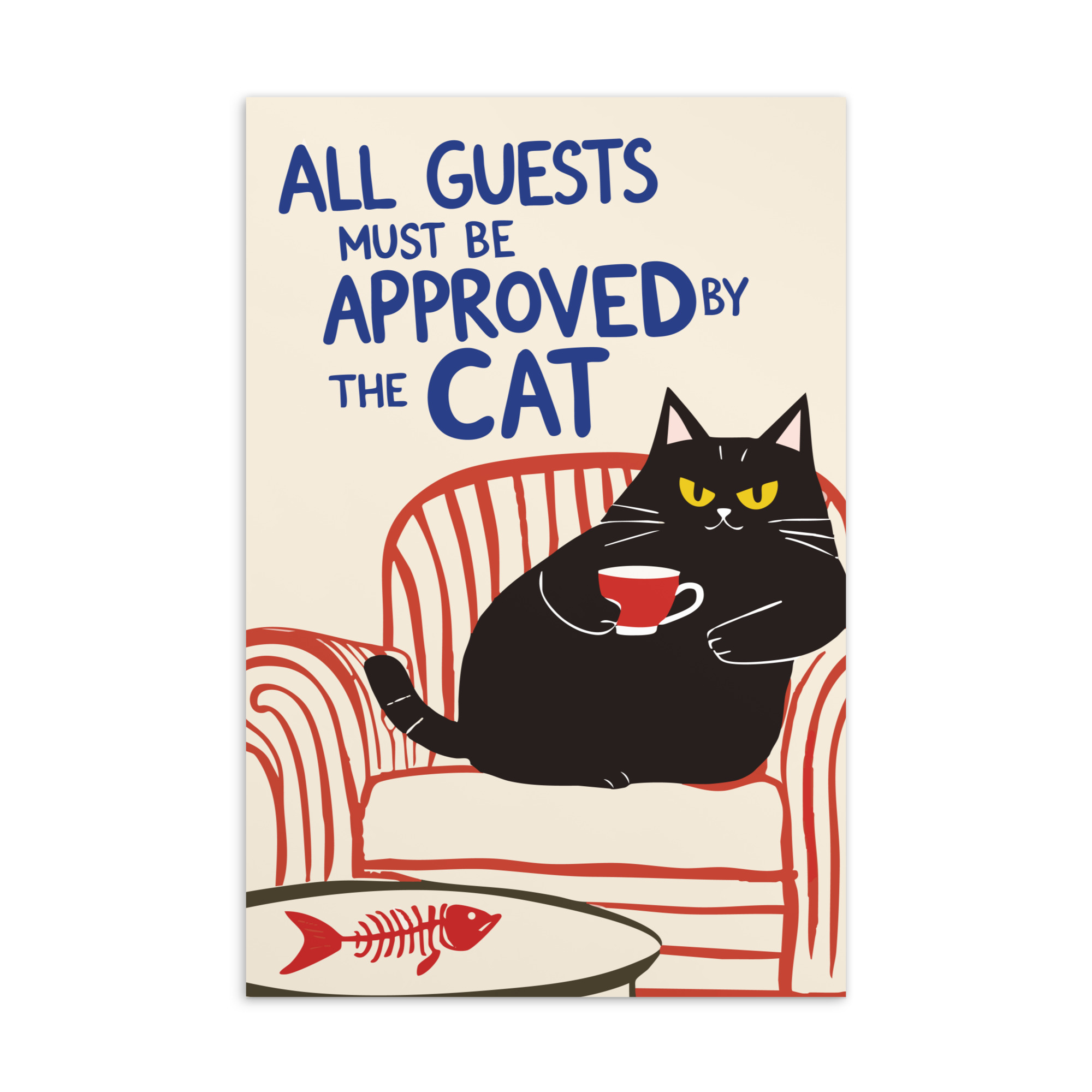 Fantastiskt vykort med en svart katt som sitter i en fåtölj och texten ’All guests must be approved by the cat’ som tryck. Kortet kan skickas till kattälskaren eller ramas in som ett mindre konstverk. Tillverkat i kraftigt papper av hög kvalitet. Höjden är 15,2 cm.