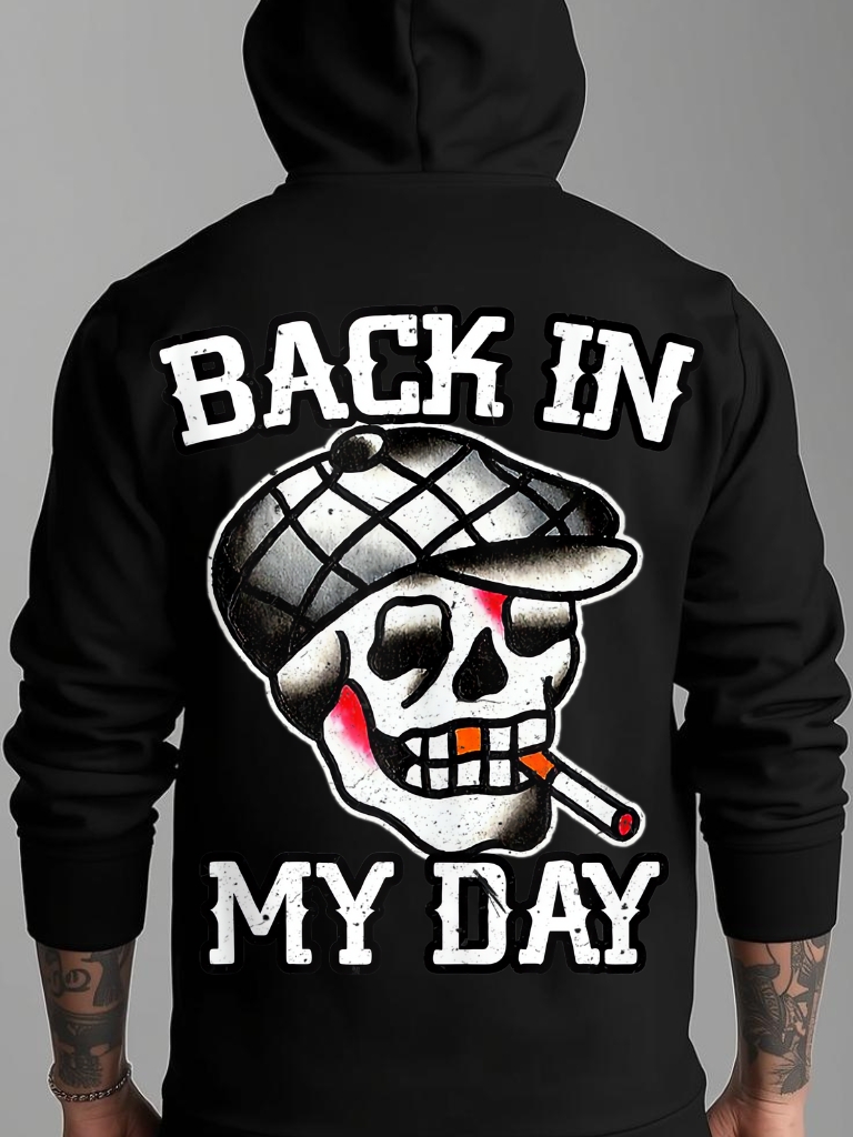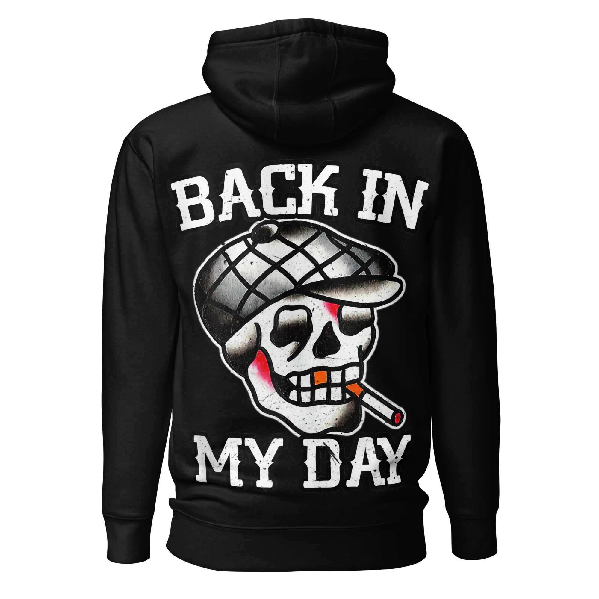 Hoodie i unisex-modell tillverkad i en extra fin kvalitet i blandad bomull och polyester. På baksidan återfinns en stor tatueringsinspirerad dödskalle som röker en cigarett i old school-stil och texten ’Back in my day’ som dekoration. Hoodien håller värmen riktigt bra och har ett otroligt mjukt tyg. Passar alla oss som älskar tatueringskonsten.