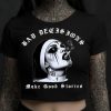 Snygg crop top dekorerad med en nunna som röker en cigarett och texten ’Bad decisions make good stories’ på framsidan. Tillverkad i kammad bomull i en fin kvalitet. Passar alla kvinnor som älskar attityd.