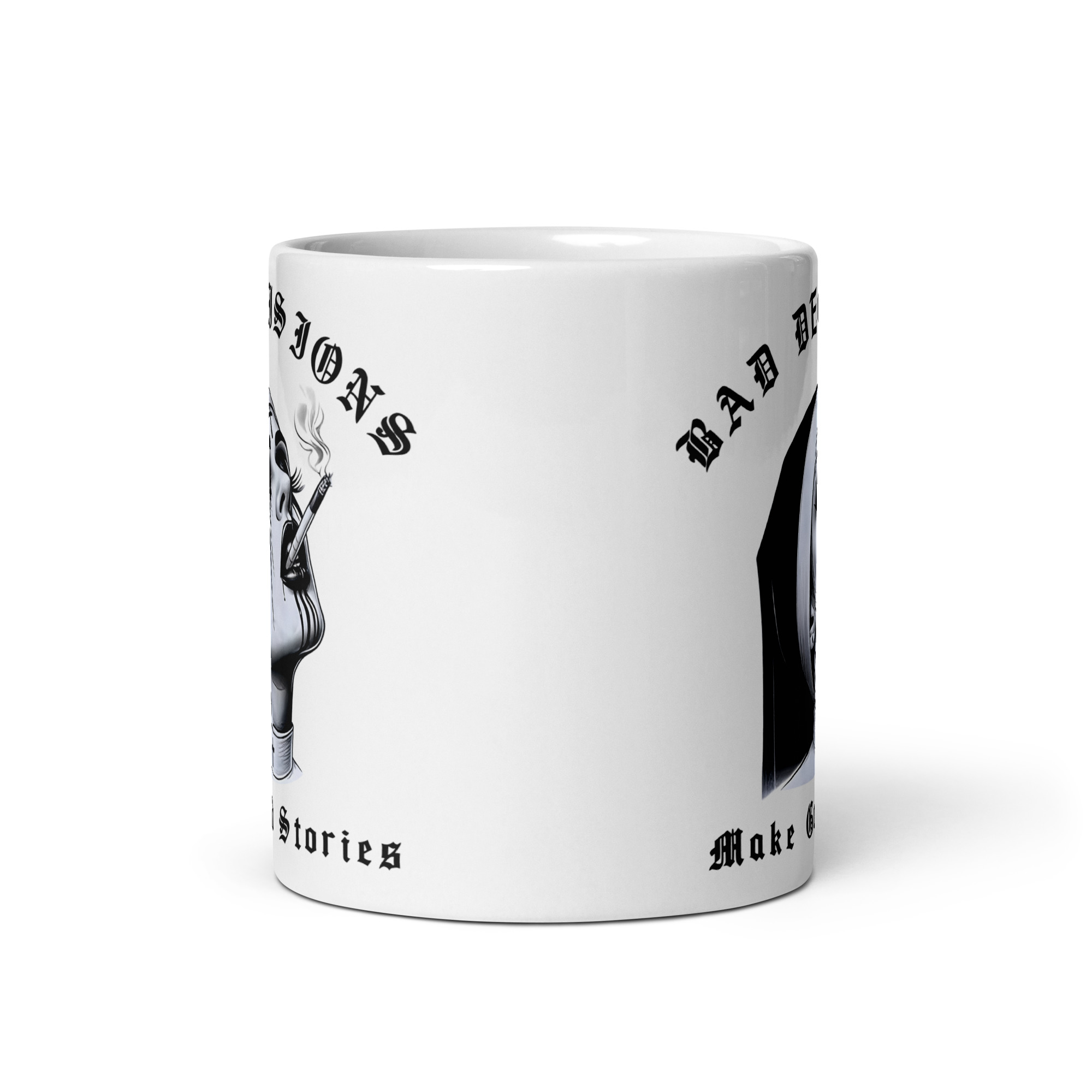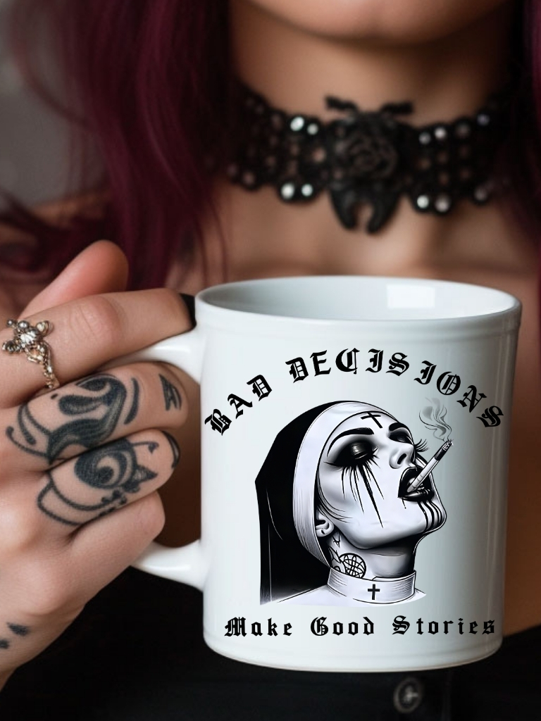 Mugg i vitt med en nunna som röker och texten ’Bad decisions make good stories’ som tryck på båda sidorna. Tillverkad i keramik med en höjd på 9,5 cm. Kommer passa perfekt till alla som gör mycket misstag i livet.