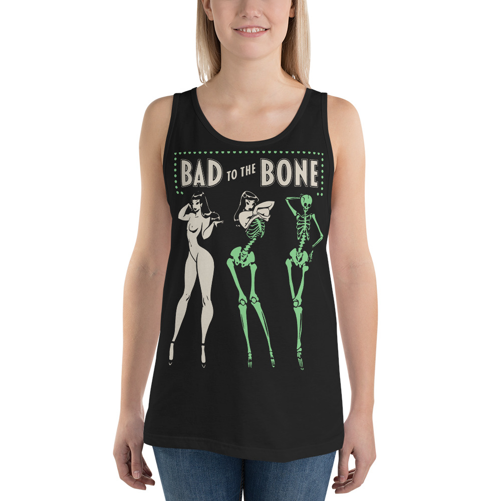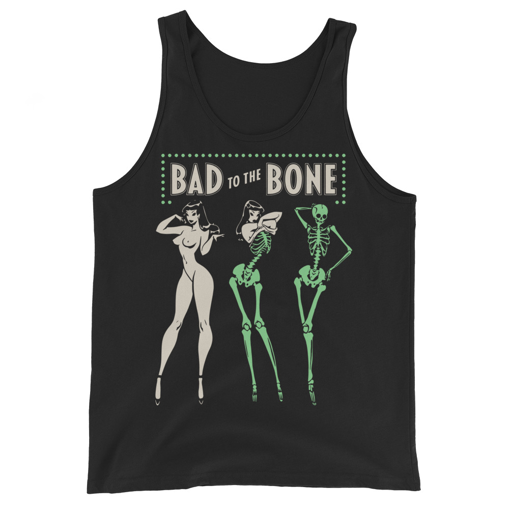 Linne i svart med en naken kvinna som förvandlas till ett skelett och texten ’Bad to the bone’ som dekoration på framsidan. Tillverkad i en skön kvalitet i 100% bomull. Passar perfekt till både män och kvinnor som älskar den alternativa stilen.