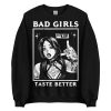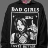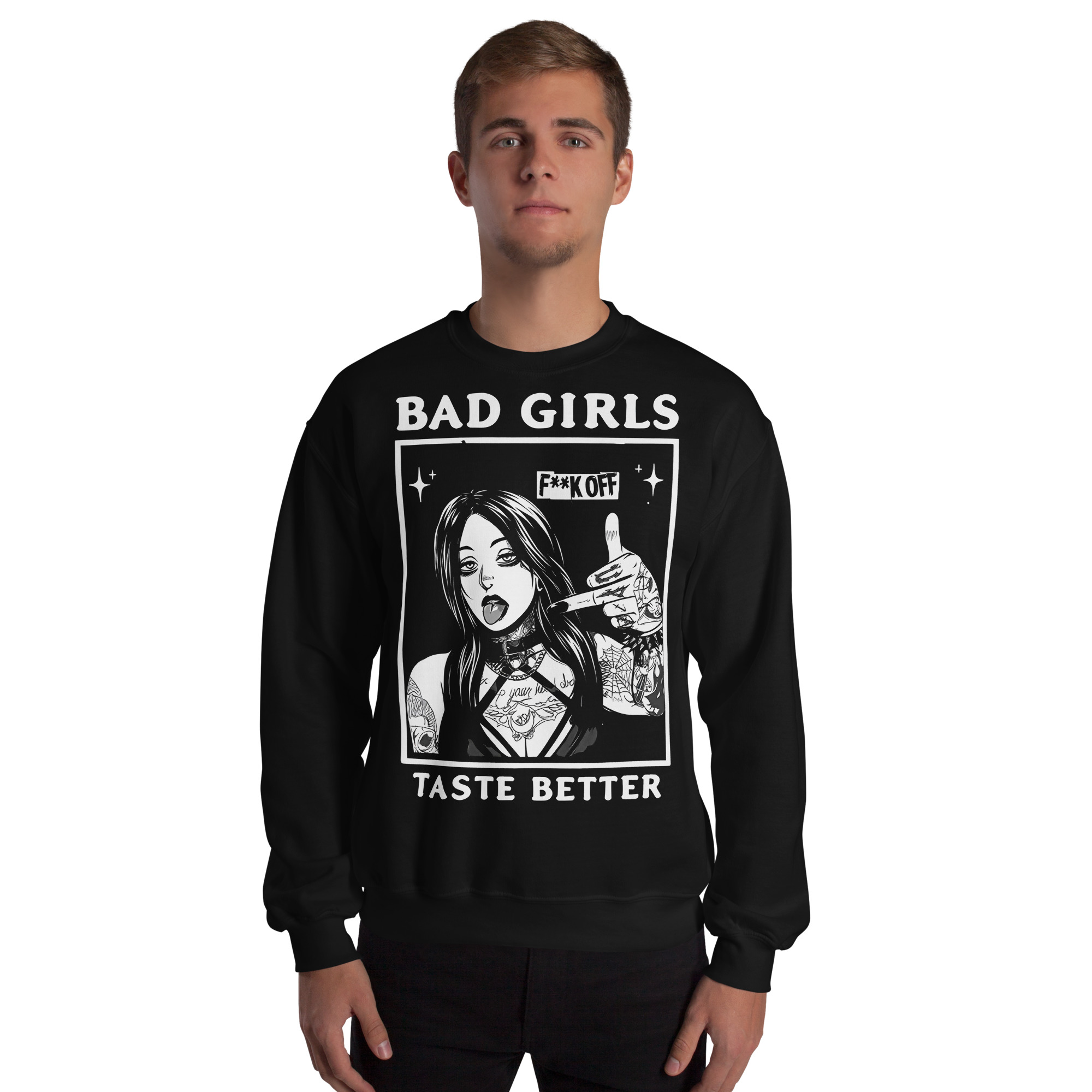 Varm och skön sweatshirt i svart tillverkad i blandad bomull/polyester med ett alternativt tryck med en tatuerad kvinna med attityd och texten ’Bad girls taste better’ som dekoration på framsidan. Tröjan passar perfekt till både män och kvinnor som älskar alternativa kläder.