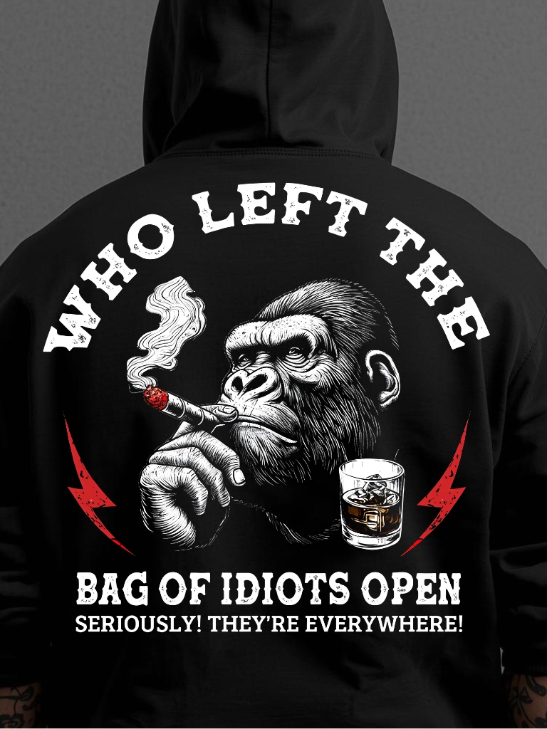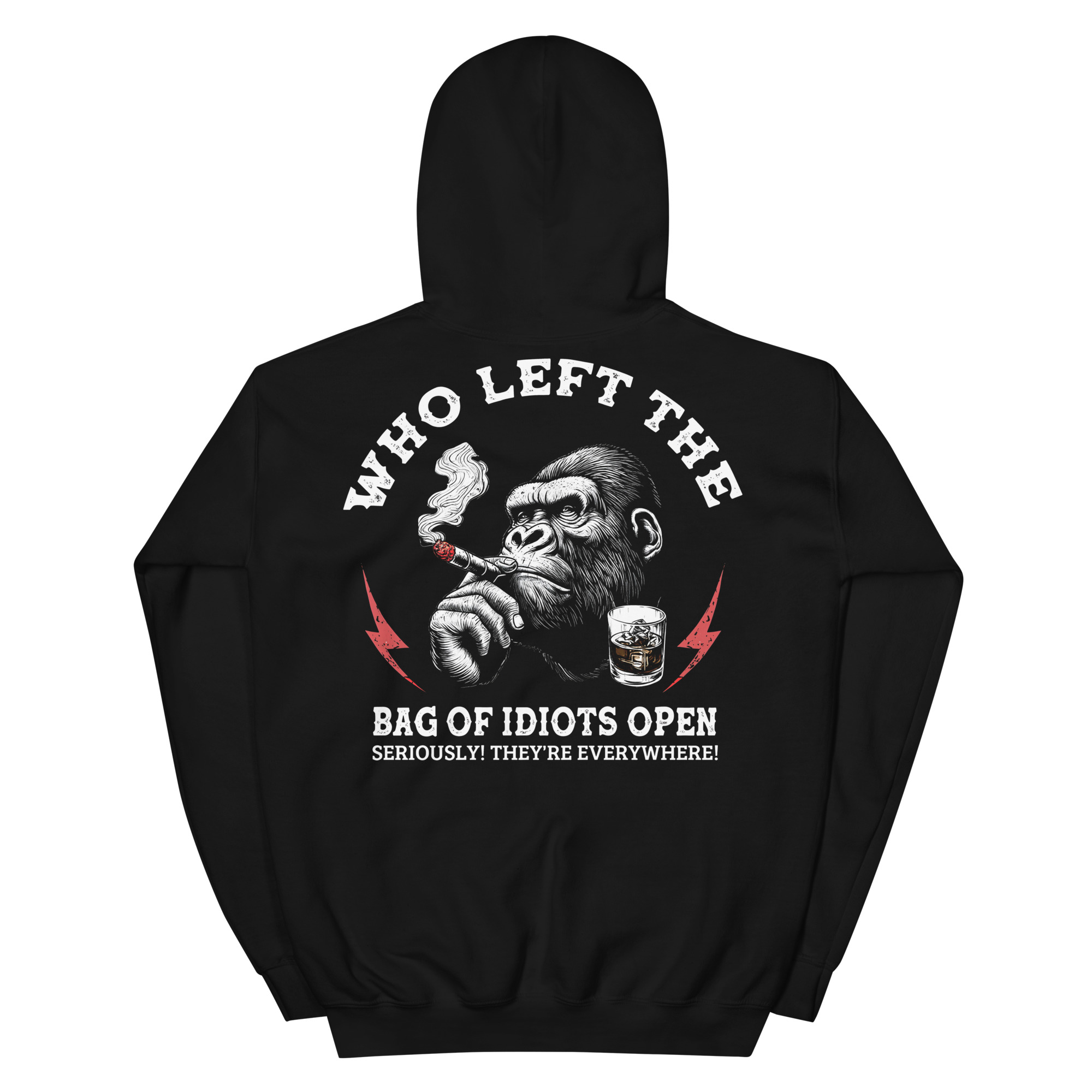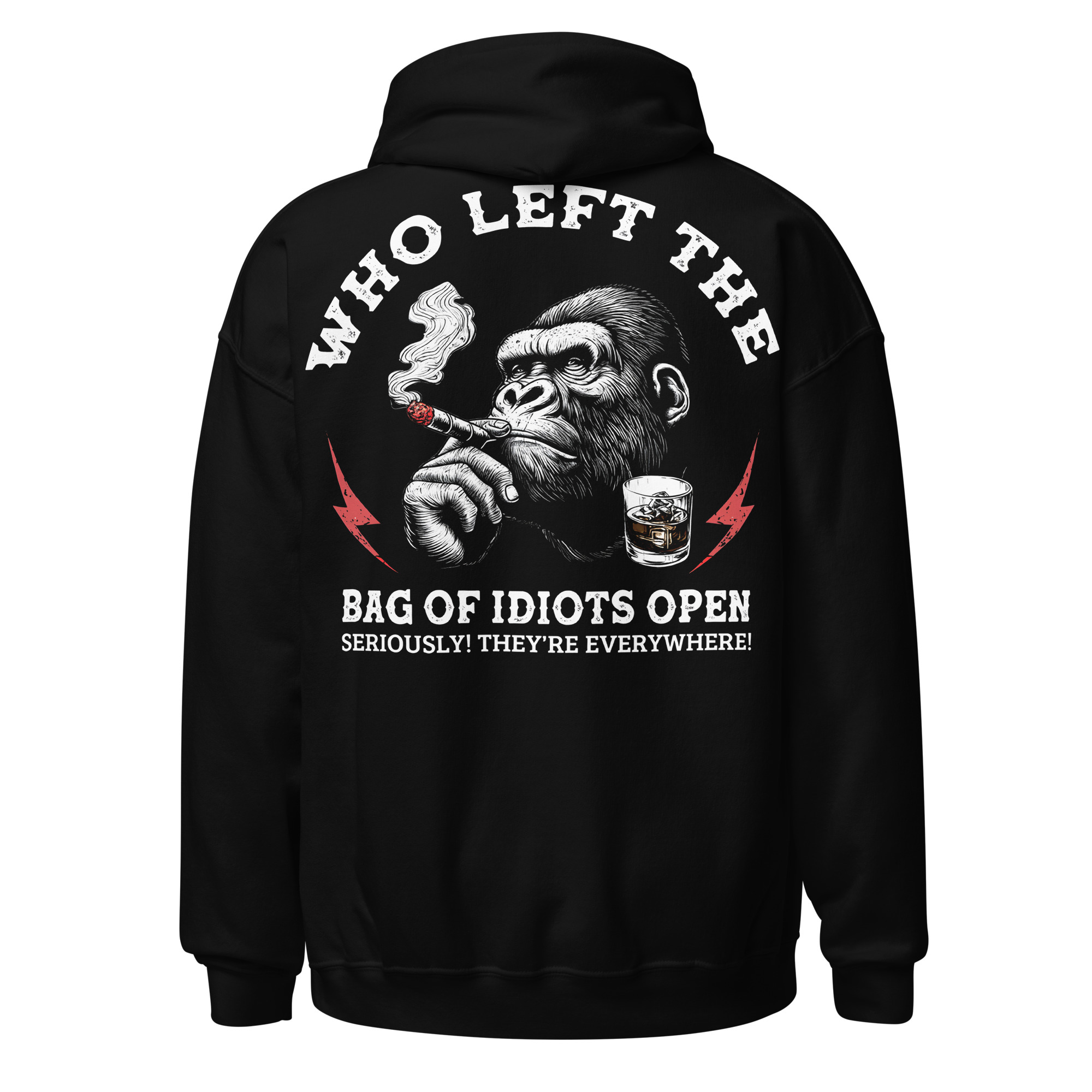 Hoodie i unisex-modell tillverkad i en extra fin kvalitet i blandad bomull och polyester. På baksidan återfinns ett stort tryck med en apa som röker och texten ’Who left the bag of idiots open?’ som dekoration. Hoodien håller värmen riktigt bra och har ett otroligt mjukt tyg.