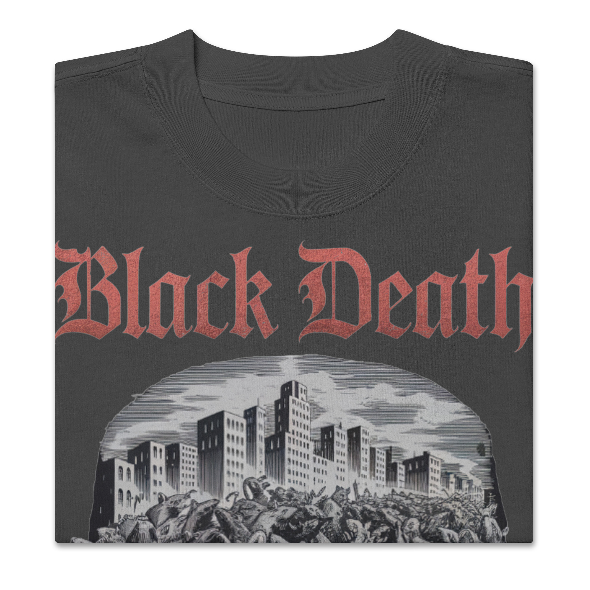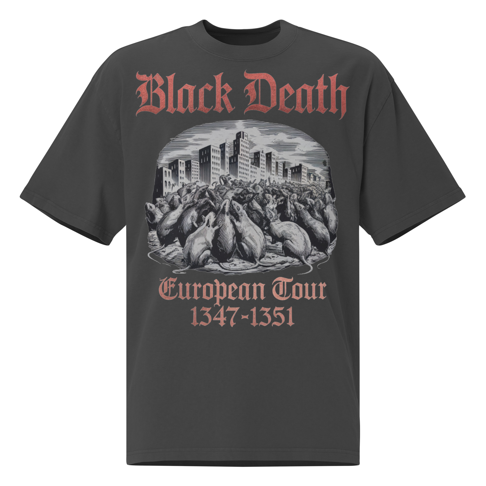 T-shirt i oversize-modell med ett gäng råttor och texten ’Black death european tour’ som motiv på framsidan. Tröjan passar perfekt till både män och kvinnor. Materialet är kammad bomull av hög kvalitet i en snygg tvättad vintage-färg. T-shirten är förkrympt så den tappar inte form eller storlek efter tvätt. Kommer verkligen dra blickarna till sig med sin använda look.