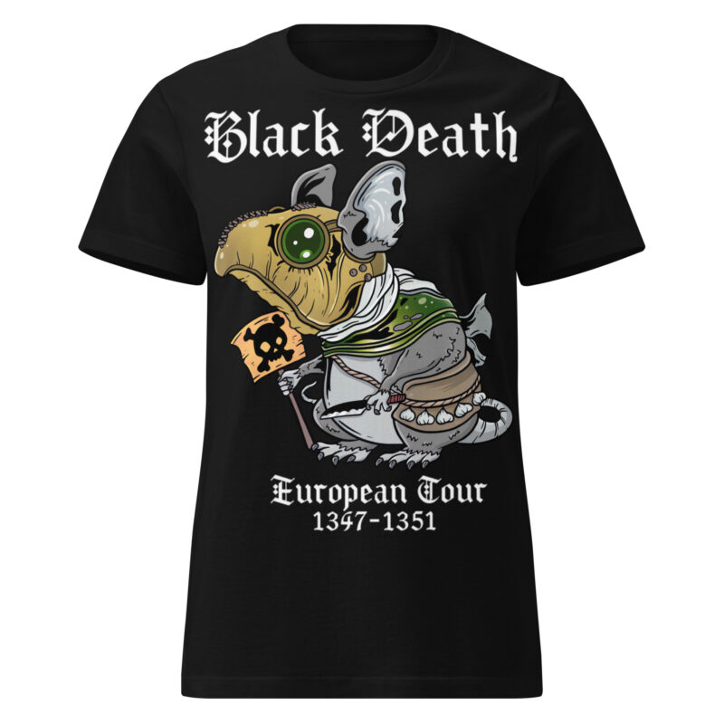 Semi-fitted t-shirt i svart med en annorlunda råtta och texten ’Black death european tour’ som dekoration på framsidan. Passar perfekt till kvinnor som älskar den alternativa klädstilen. Tröjan är tillverkad i en supermjuk kvalitet i 100% bomull.