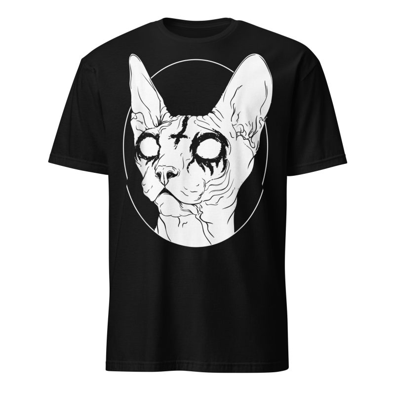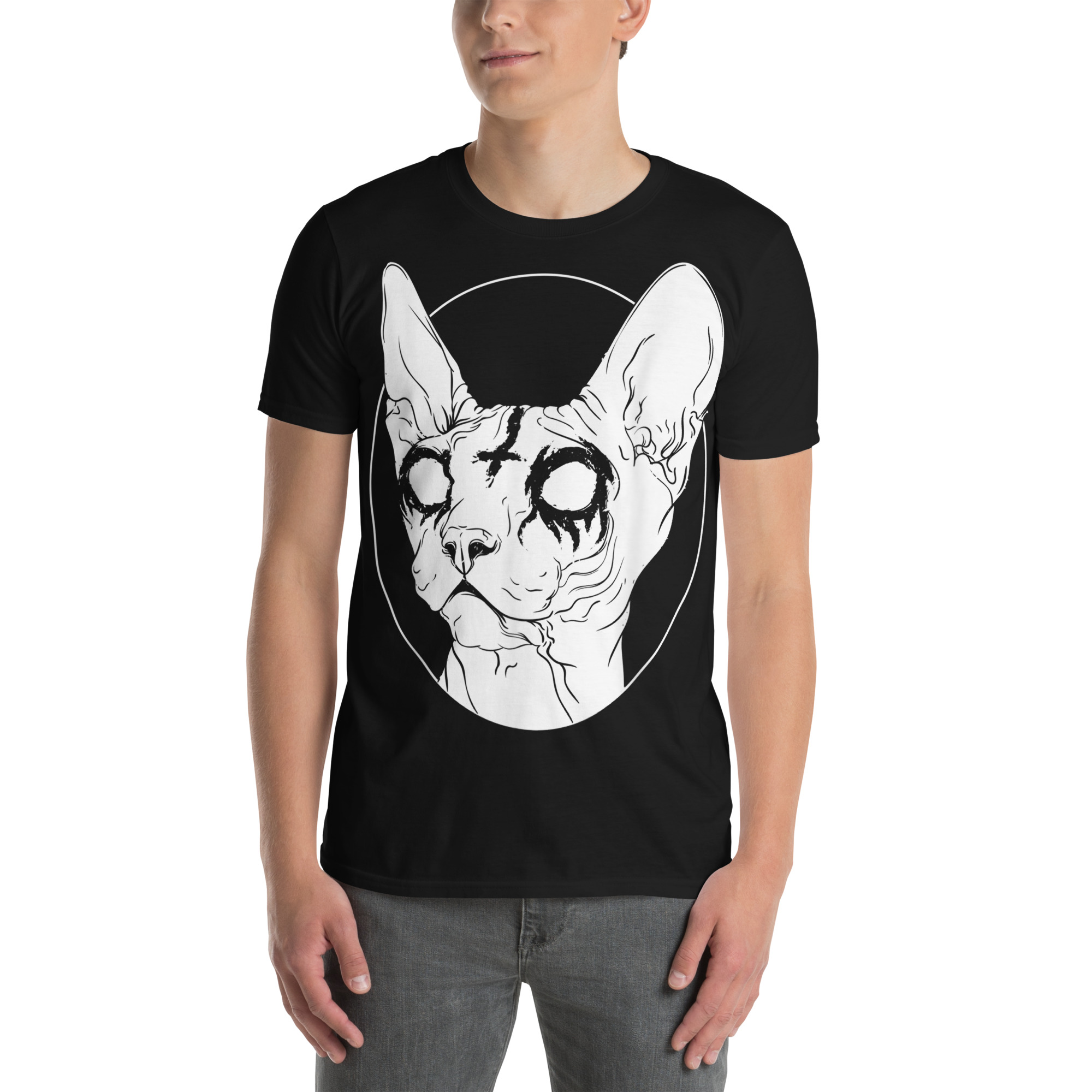 T-shirt i svart med ett alternativt tryck med en black metal-sminkad sphynx-katt som dekoration på framsidan. Passar perfekt till både män och kvinnor som älskar den alternativa klädstilen. Tröjan är tillverkad i en supermjuk kvalitet i 100% bomull.
