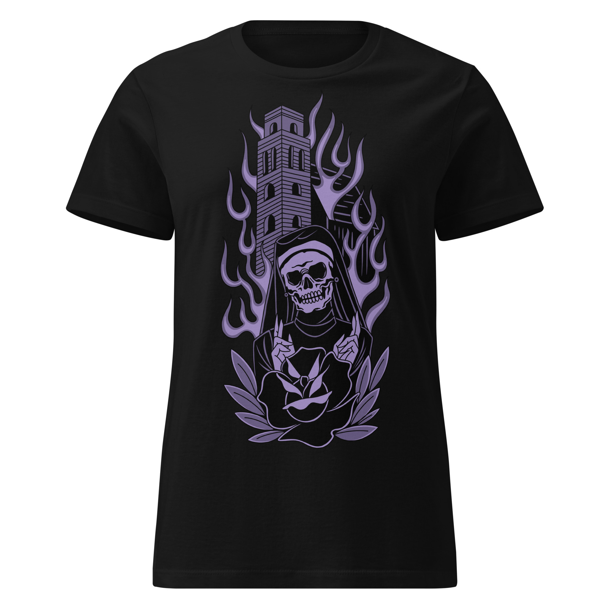 Semi-fitted t-shirt i svart med ett tatueringsinspirerat motiv med en nunna framför en brinnande kyrka som dekoration på framsidan. Passar perfekt till kvinnor som älskar alternativa kläder. Tröjan är tillverkad i en supermjuk kvalitet i 100% bomull.