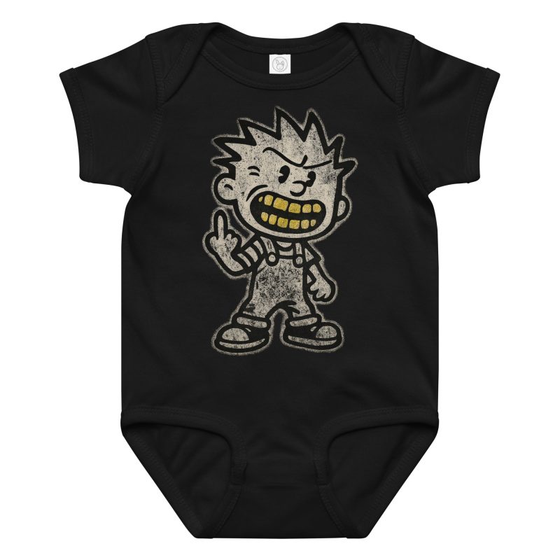 Riktigt söt body i svart med en seriefigur med attityd som visar långfingret som dekoration på framsidan. Materialet är 100% ringspunnen bomull i en fin kvalitet. Passar perfekt till alla bebisar med attityd.