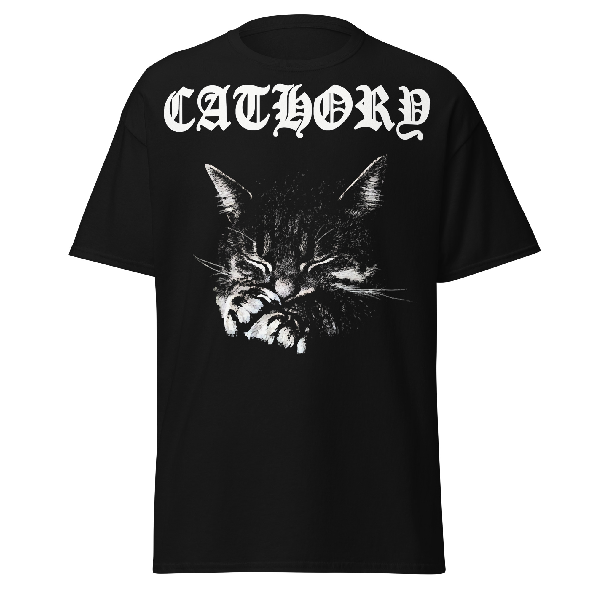 T-shirt i svart med en katt och texten ’Cathory’ som dekoration på framsidan. Passar perfekt till kvinnor och män som älskar alternativa kläder. Tröjan är tillverkad i en supermjuk kvalitet i 100% bomull. Sista exet – storleken är Large.