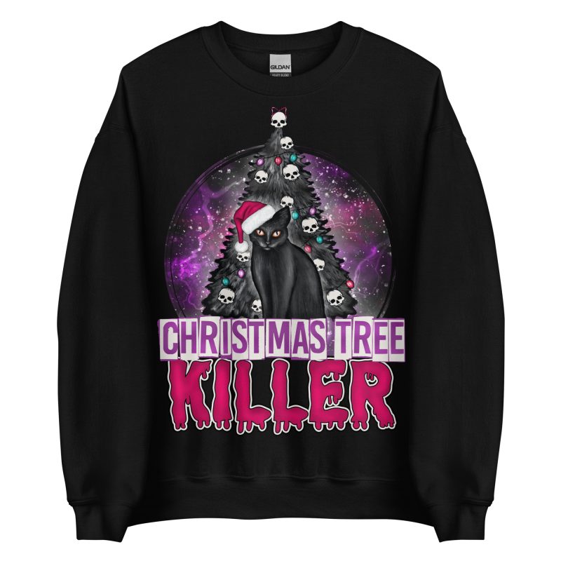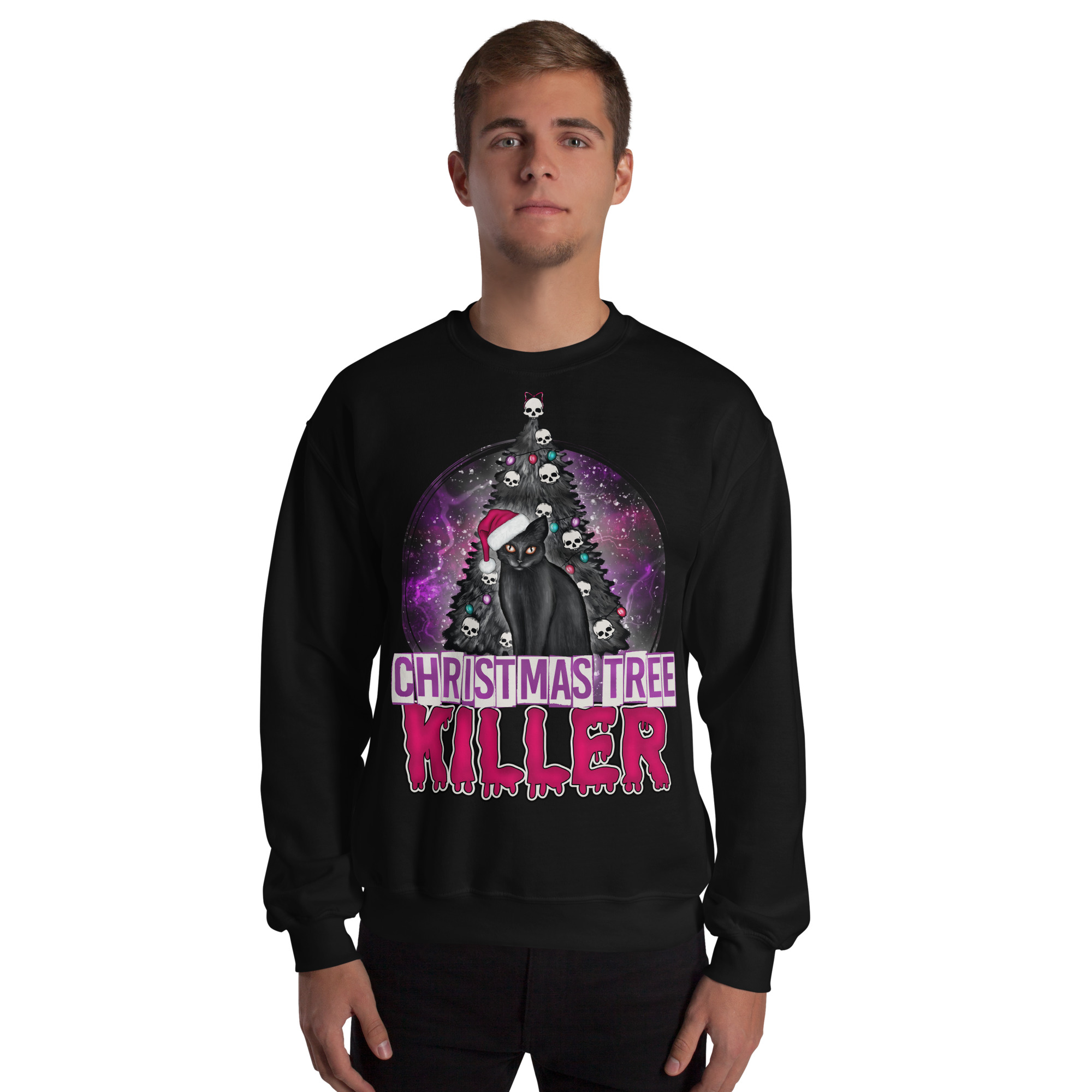Varm och skön jultröja i svart tillverkad i blandad bomull/polyester med ett stort alternativt julmotiv med en svart katt framför en julgran och texten ’Christmas tree killer’ som dekoration på framsidan. Tröjan passar perfekt till både män och kvinnor som älskar udda jultröjor.