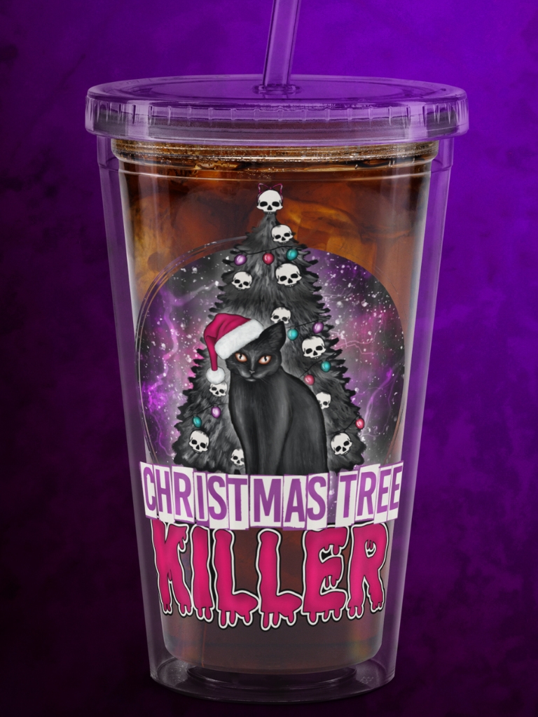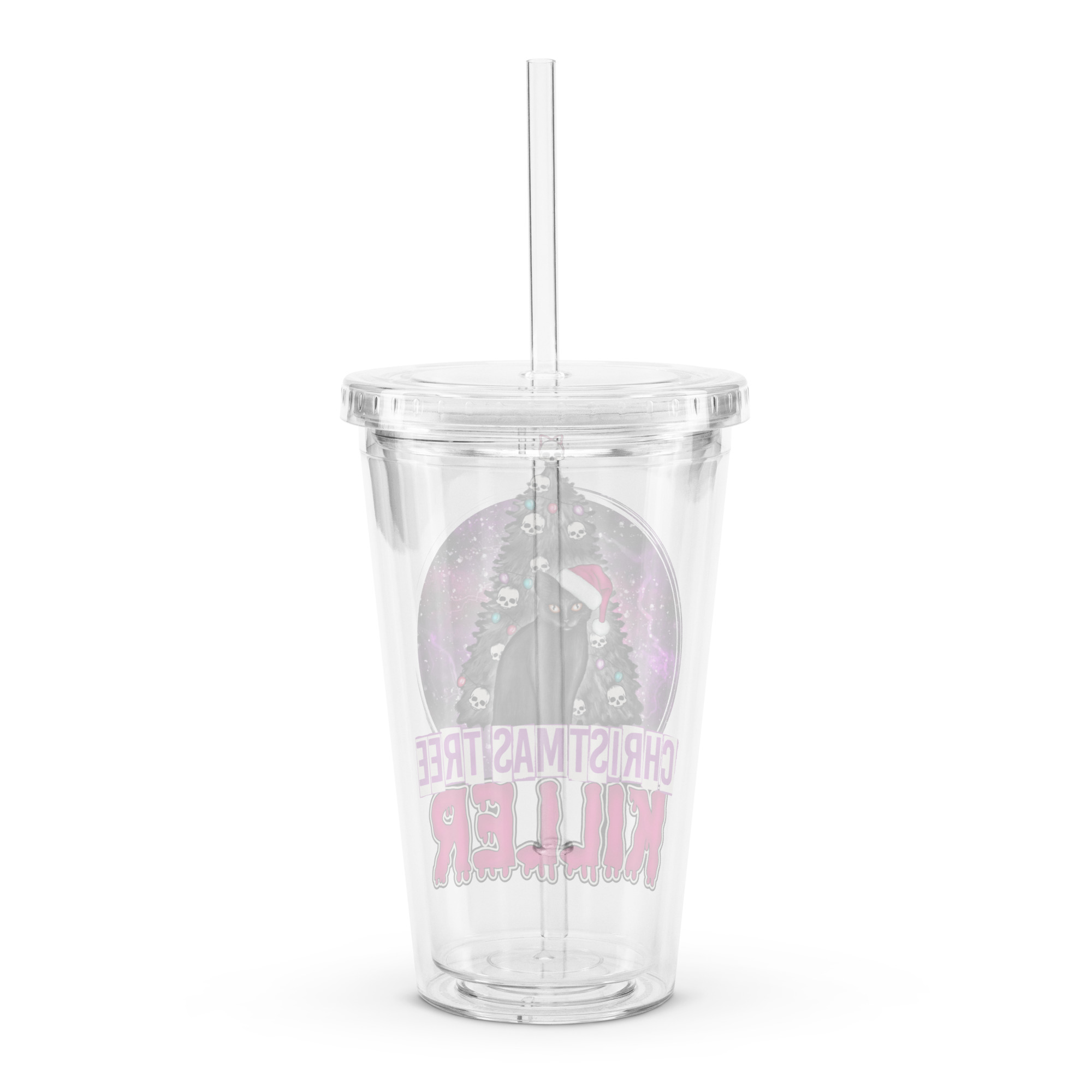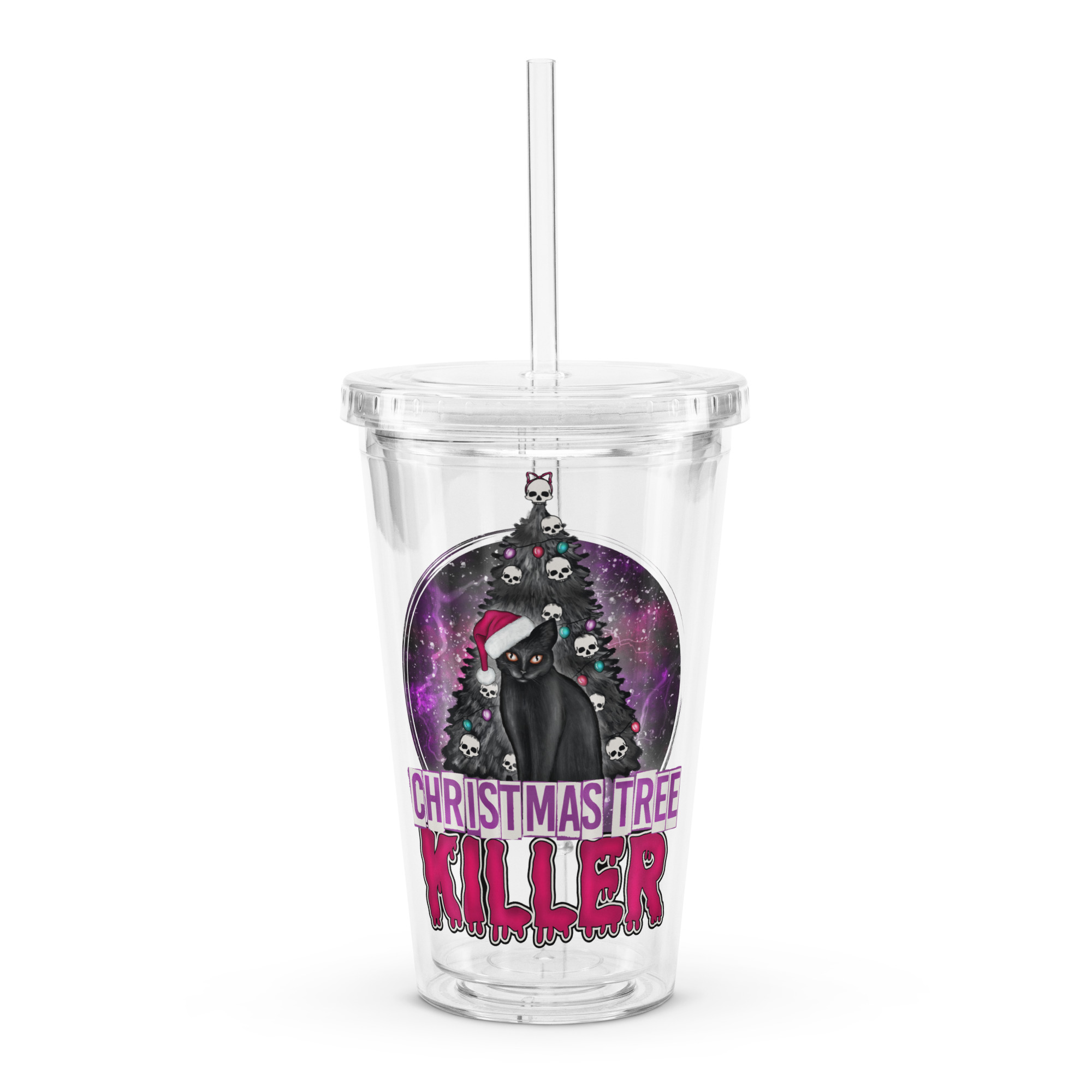 Riktigt snygg plastmugg med sugrör dekorerad med ett stort alternativt julmotiv med en svart katt framför en julgran och texten ’Christmas tree killer’ som tryck på framsidan. Muggen är tillverkad i akryl med en höjd på 16 cm. Kommer garanterat bli din nya favorit.