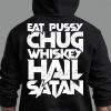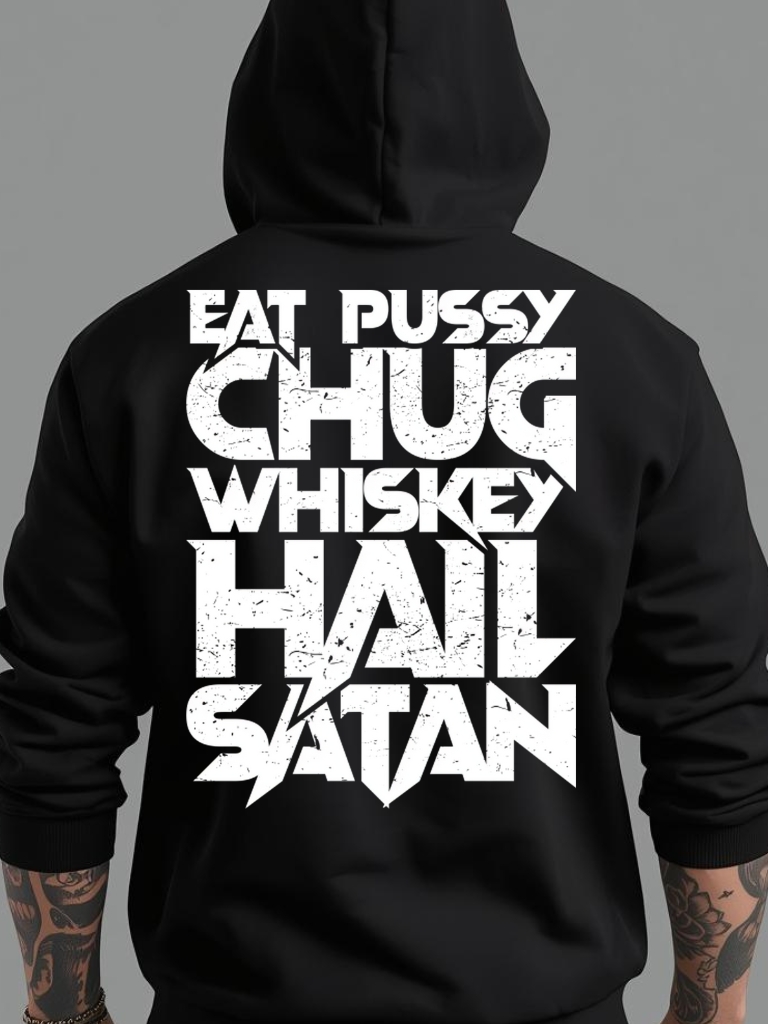 Hoodie med dragkedja och ett stort tryck på ryggen med texten ’Eat pussy, chug whiskey, hail Satan’. Passar perfekt till både män och kvinnor, materialet är blandad bomull och polyester.