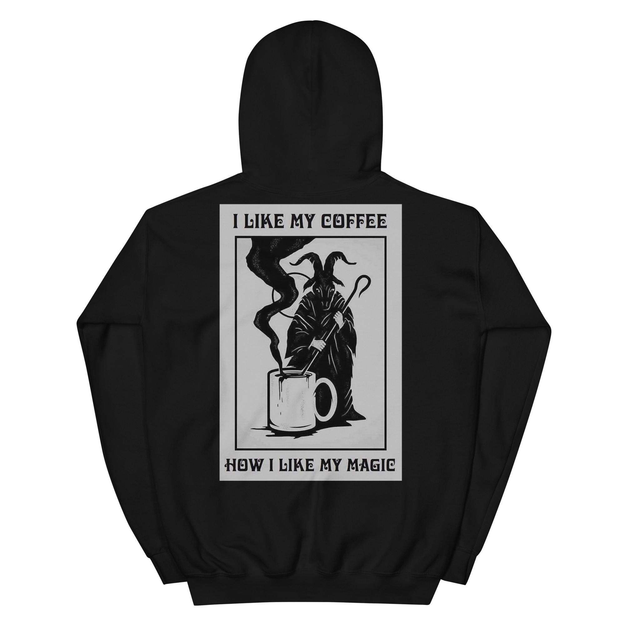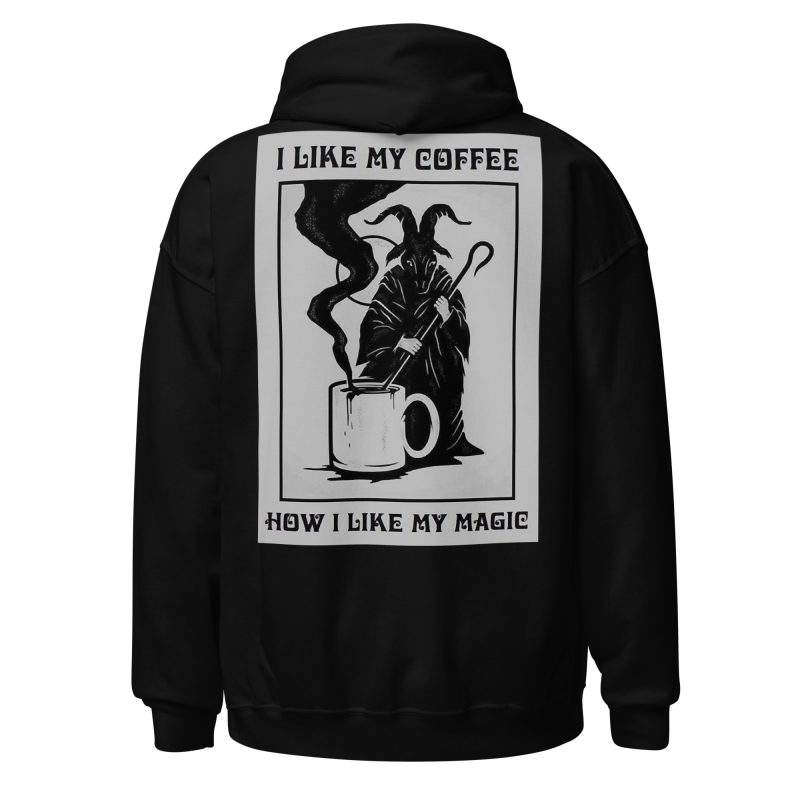 Hoodie i unisex-modell tillverkad i en extra fin kvalitet i blandad bomull och polyester. På baksidan återfinns Baphomet som rör i en stor kaffemugg och texten ’I like my coffee how I like my magic’ som dekoration. Hoodien håller värmen riktigt bra och har ett otroligt mjukt tyg.