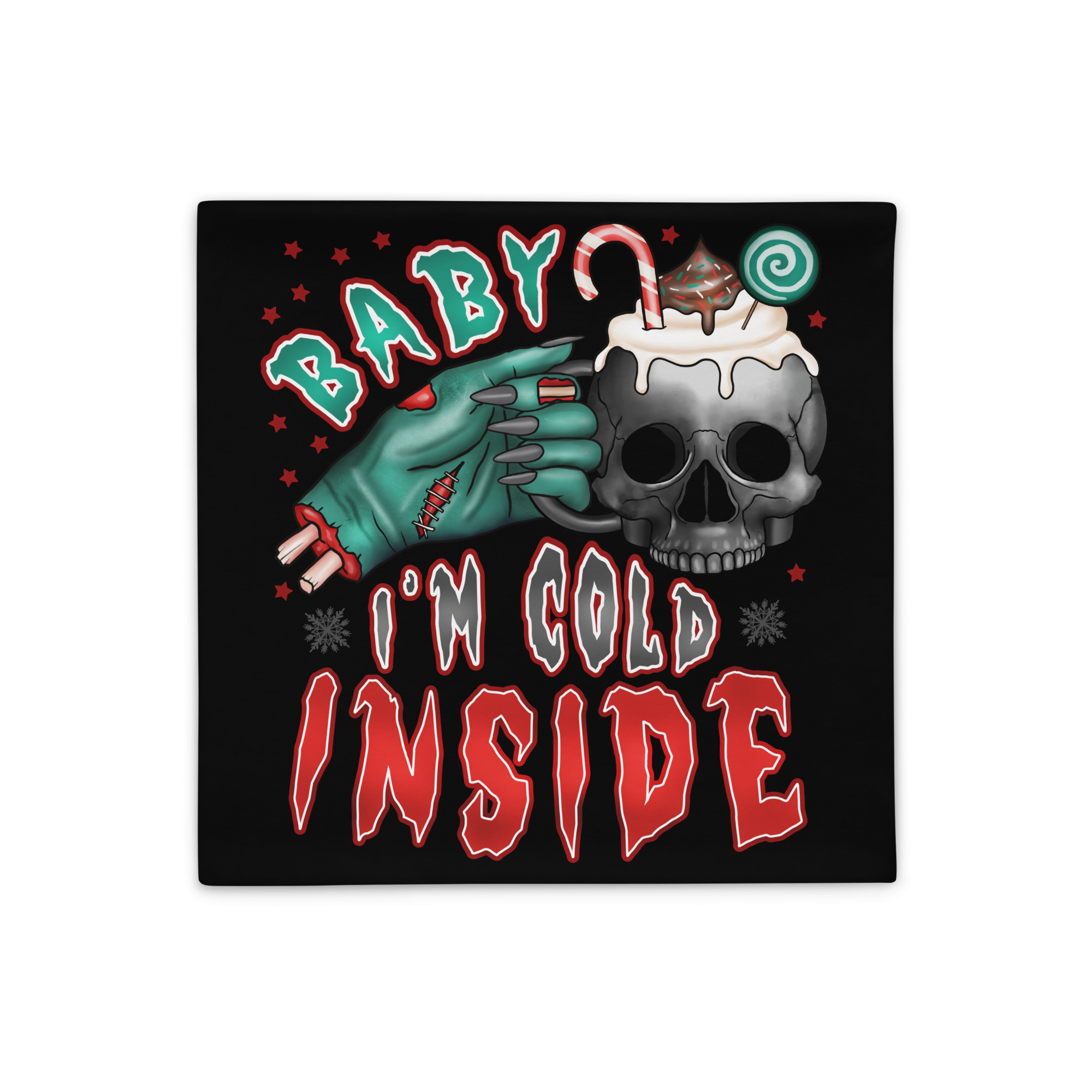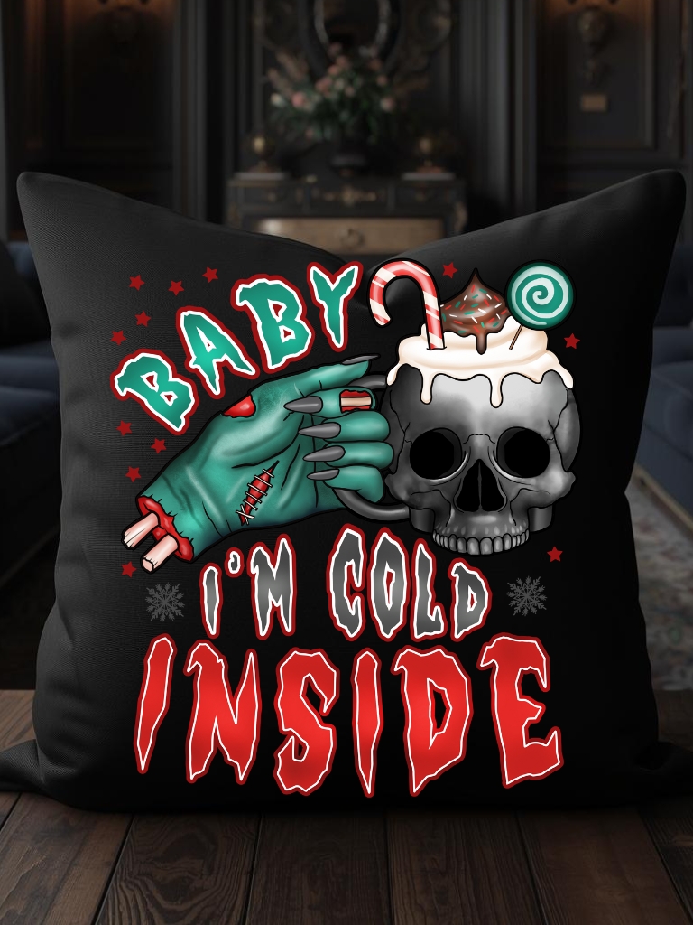 Underbart kuddfodral med ett stort julmotiv med en hand som håller i en dödskalle-mugg och texten ’Baby, I’m cold inside’ som tryck på båda sidorna. Tillverkad i 100% polyester som enkelt kan tvättas i maskin. Storleken är 45×45 cm. Observera att detta är ett kuddfodral utan innerkudde.