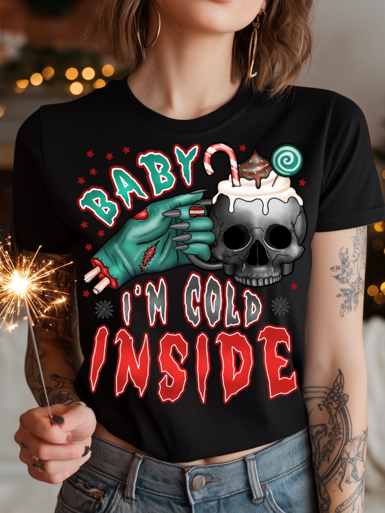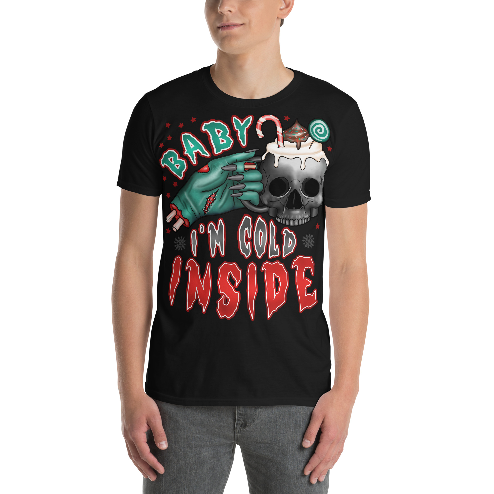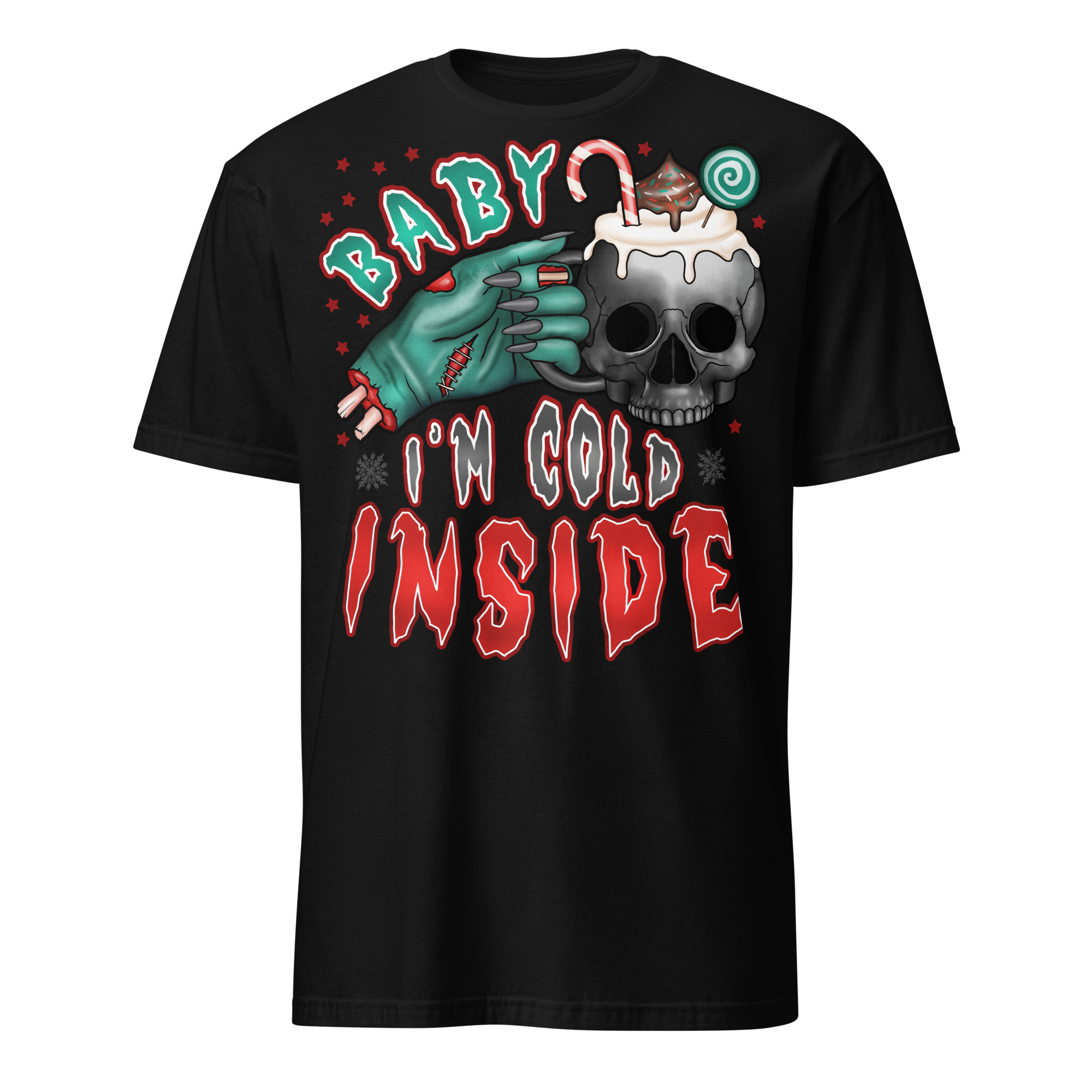 T-shirt i svart med ett stort julmotiv med en hand som håller i en dödskalle-mugg och texten ’Baby, I’m cold inside’ som dekoration på framsidan. Passar perfekt till kvinnor och män som älskar udda jultröjor. Tröjan är tillverkad i en supermjuk kvalitet i 100% bomull.