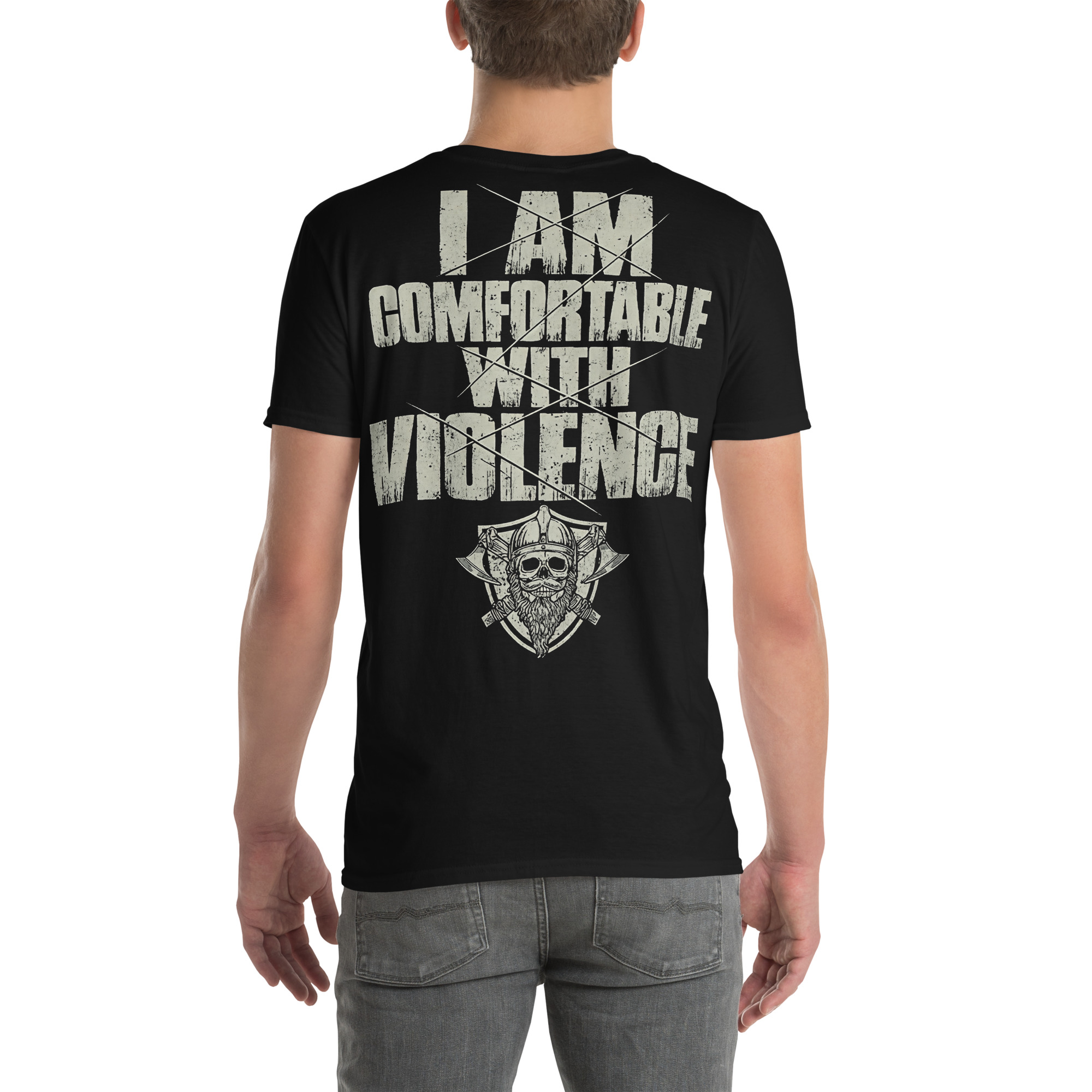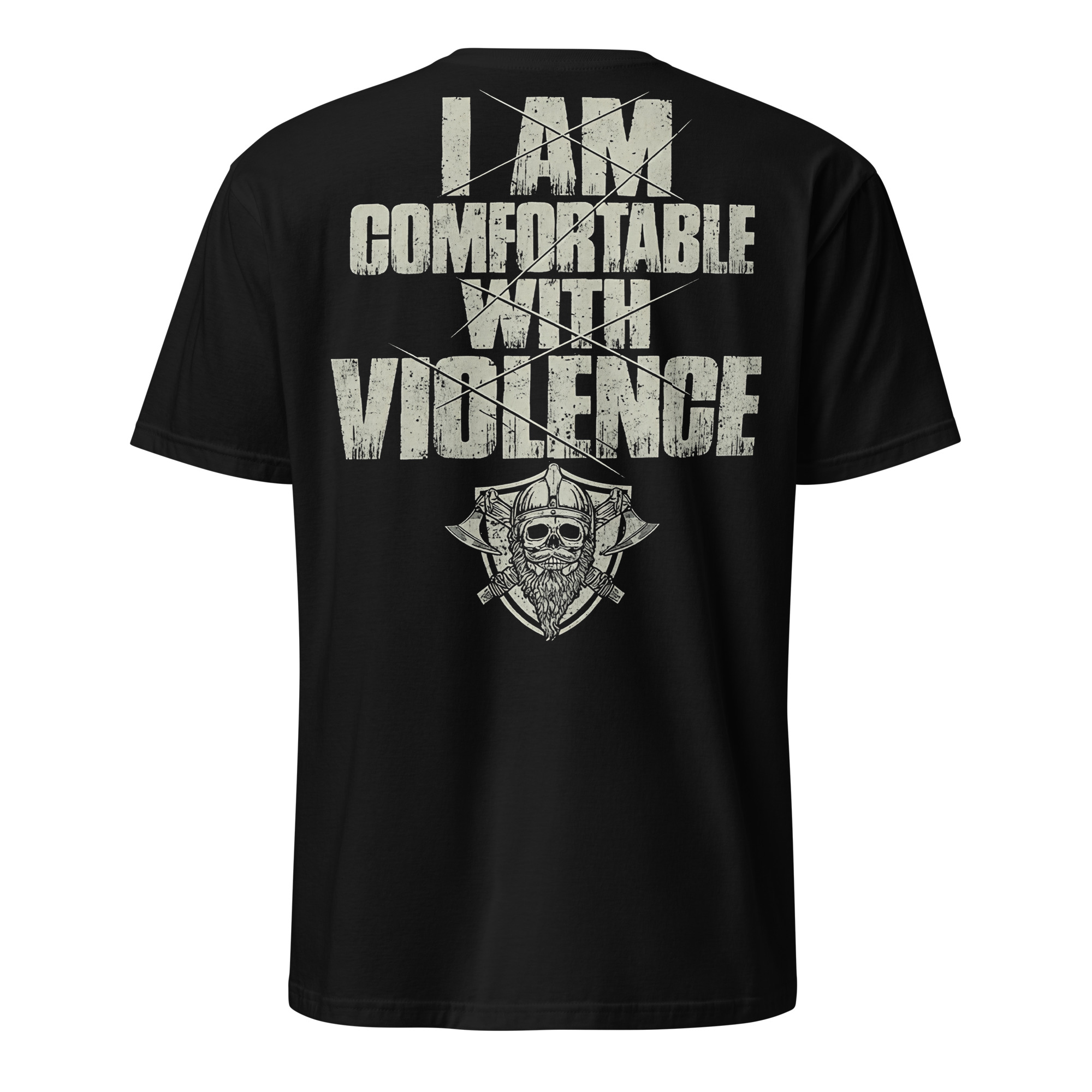 T-shirt i svart med en skäggig döskalle och texten ’I am comfortable with violence’ som dekoration på baksidan. Passar perfekt till kvinnor och män som älskar den alternativa stilen. Tröjan är tillverkad i en supermjuk kvalitet i 100% bomull.