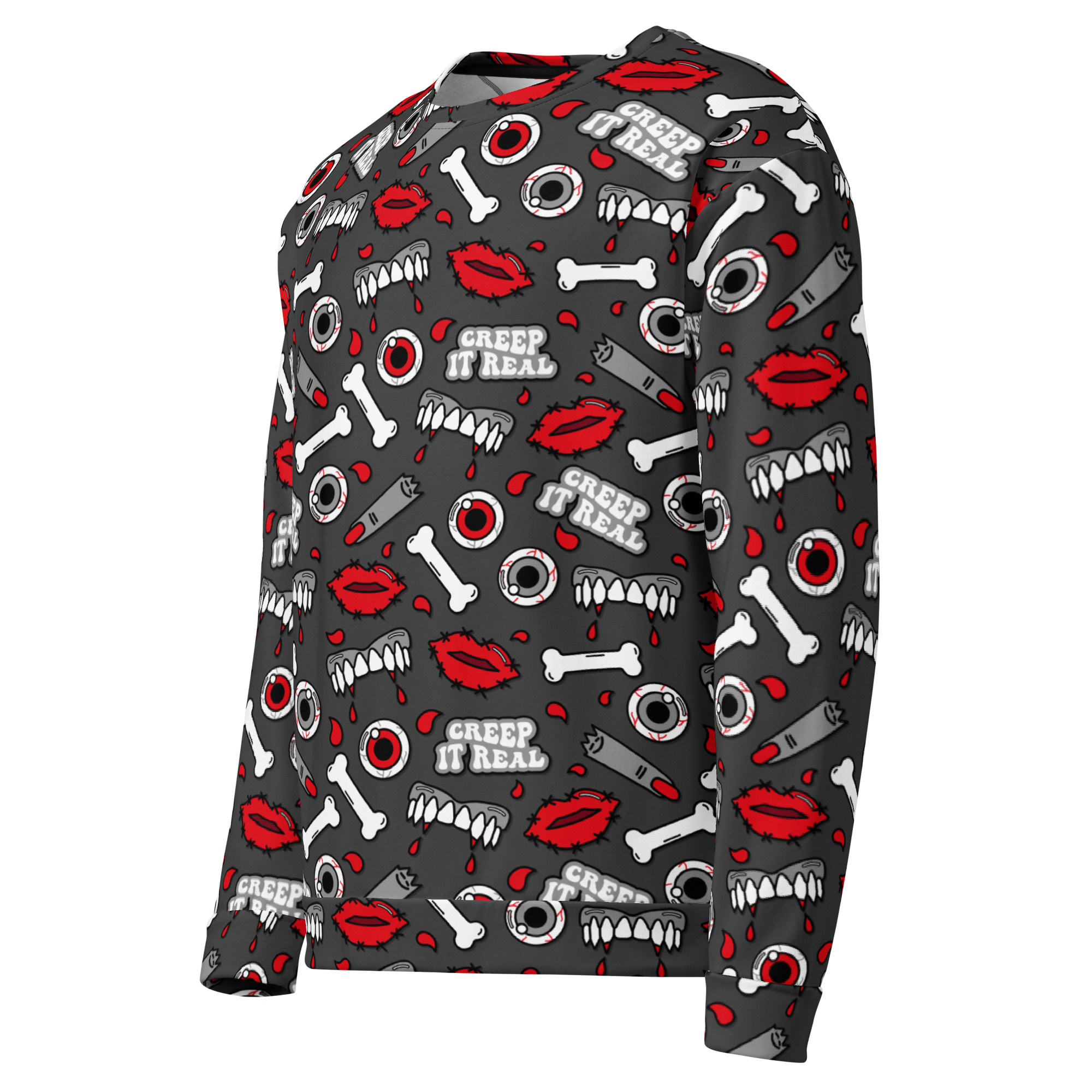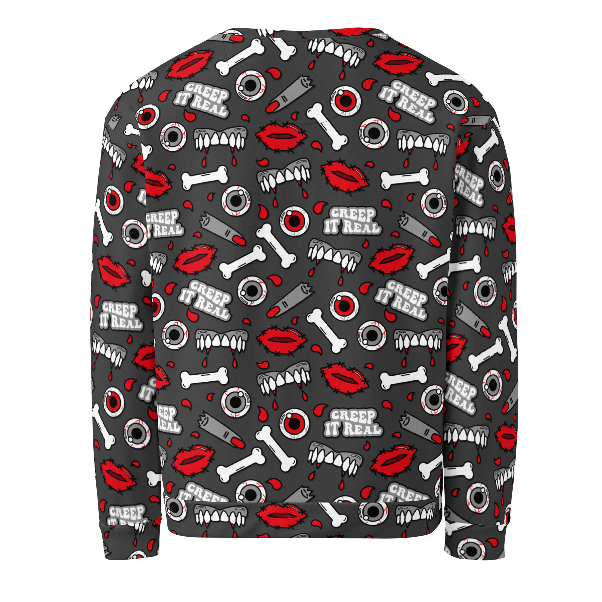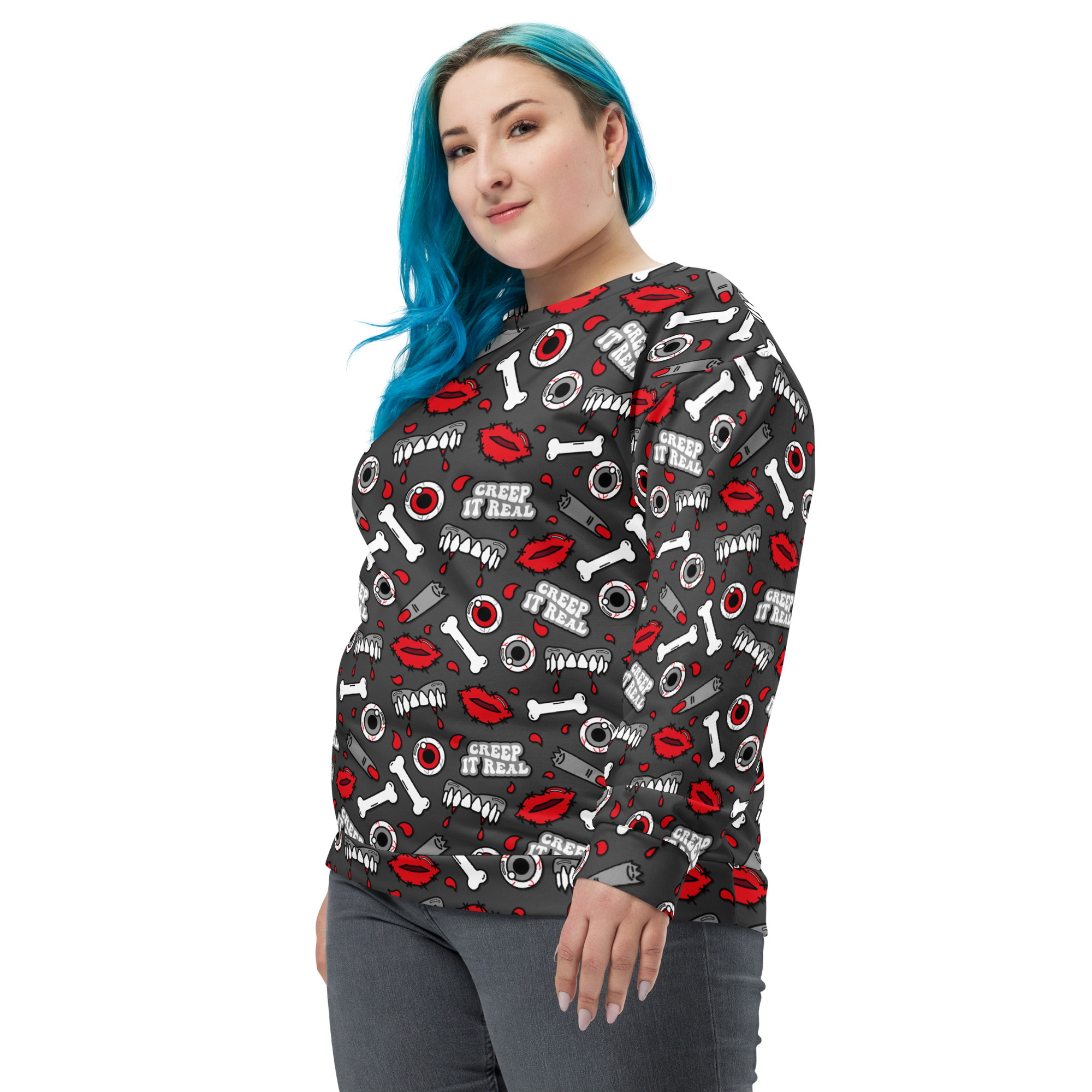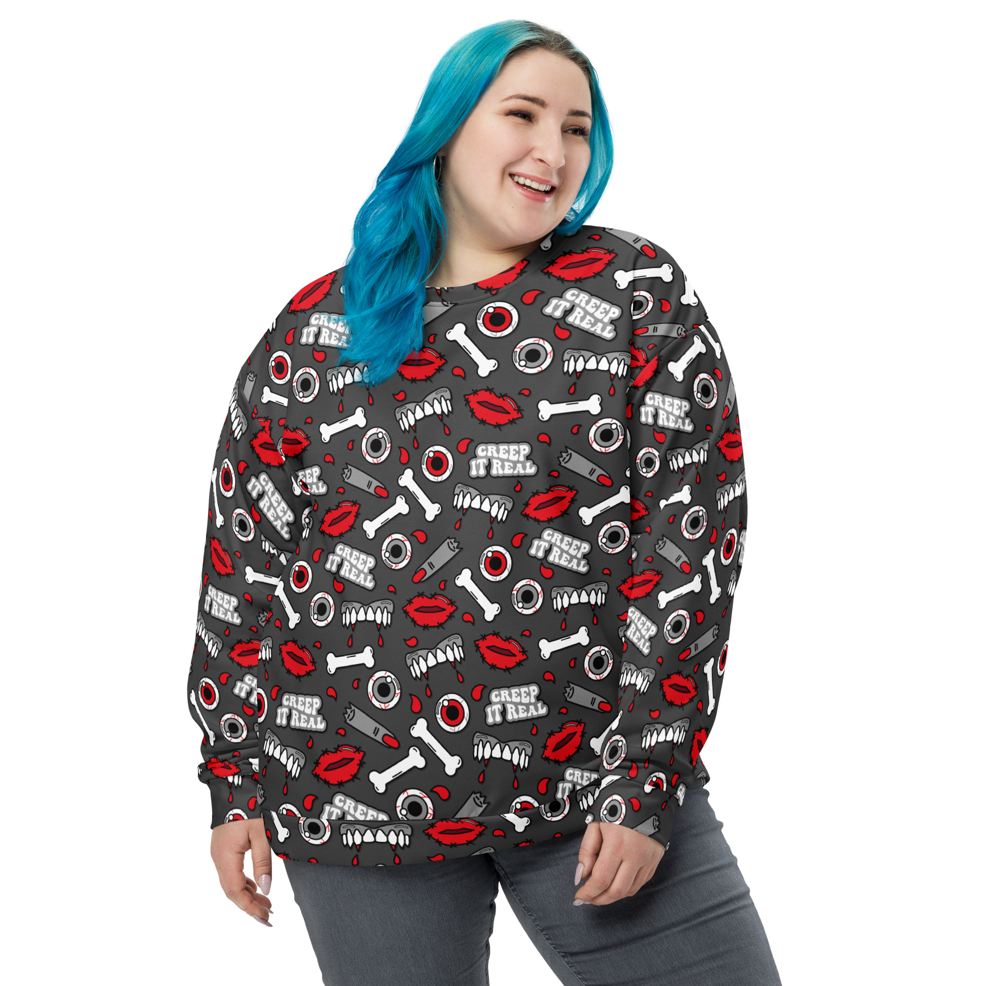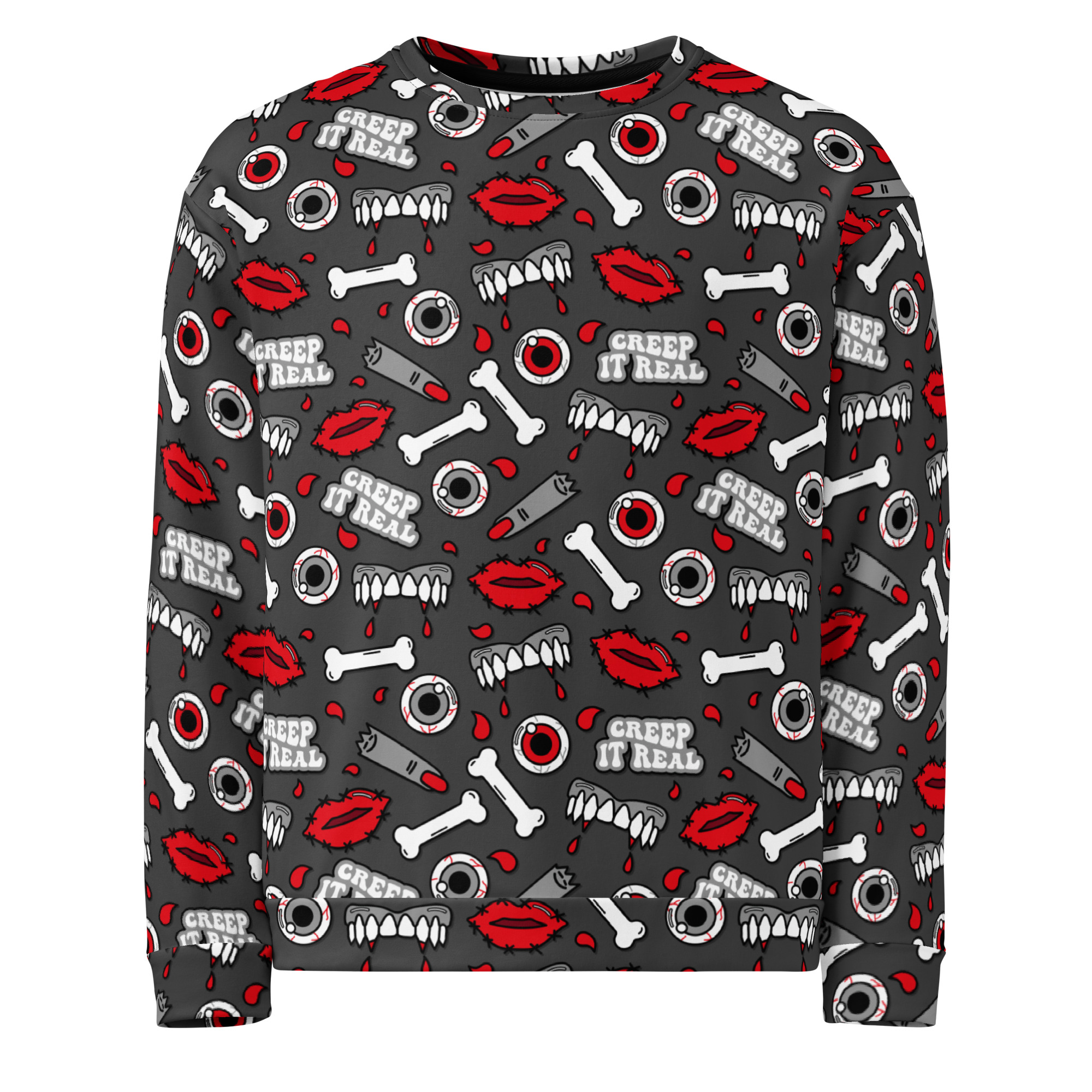 Varm och skön sweatshirt med mängder av kitschiga motiv med texten ’Creep it real’. Tillverkad i en superskön unisex-modell i blandad polyester, bomull och elastan. Tröjan har en mjuk bomullskänsla på utsidan och har varm och kammad fleece på insidan. Kommer verkligen dra blickarna till sig när du använder den och den kommer garanterat bli din nya favorit.
