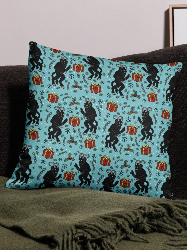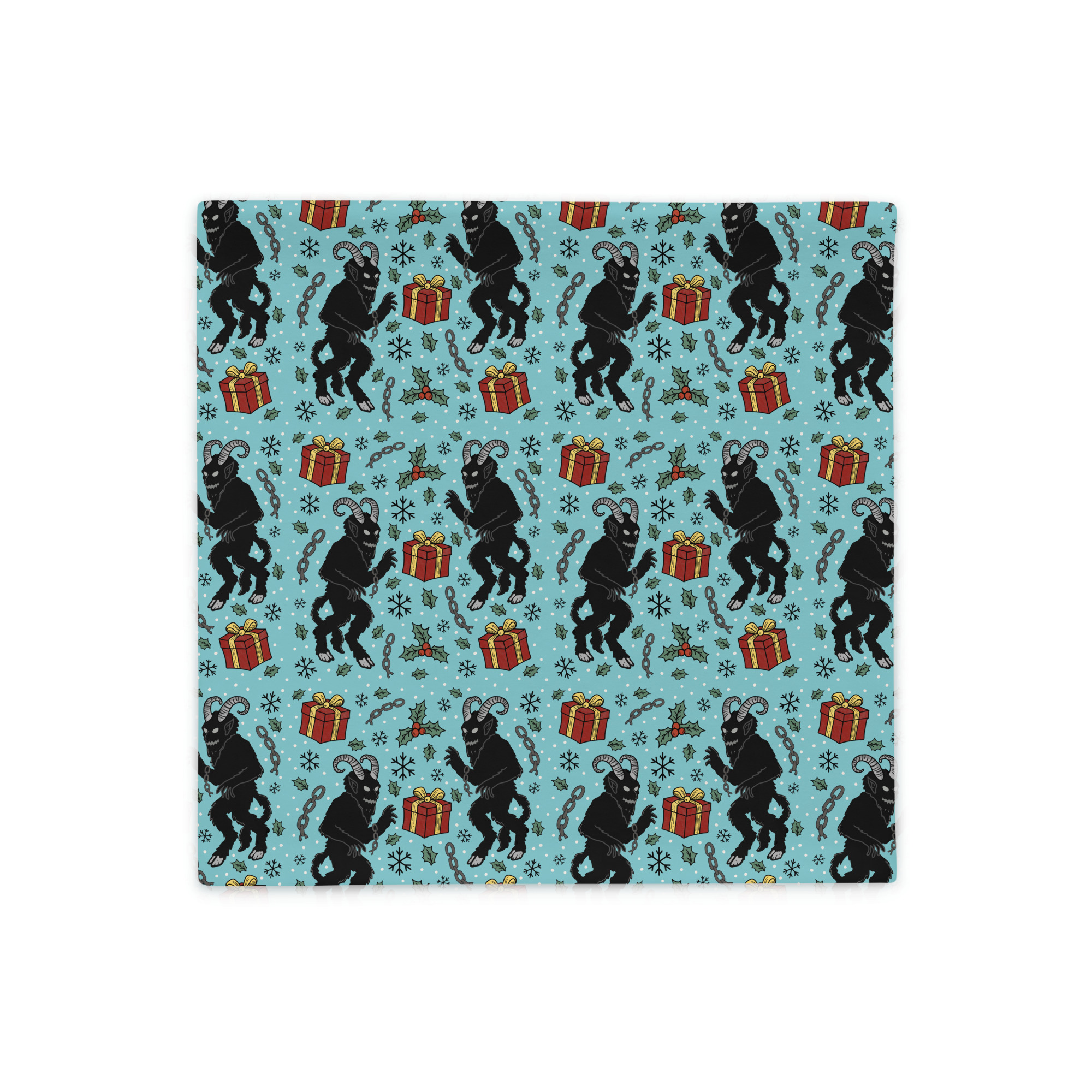 Underbart kuddfodral med mängder av julmotiv med Krampus och julklappar. Tillverkad i 100% polyester som enkelt kan tvättas i maskin. Storleken är 45×45 cm. Observera att detta är ett kuddfodral utan innerkudde.