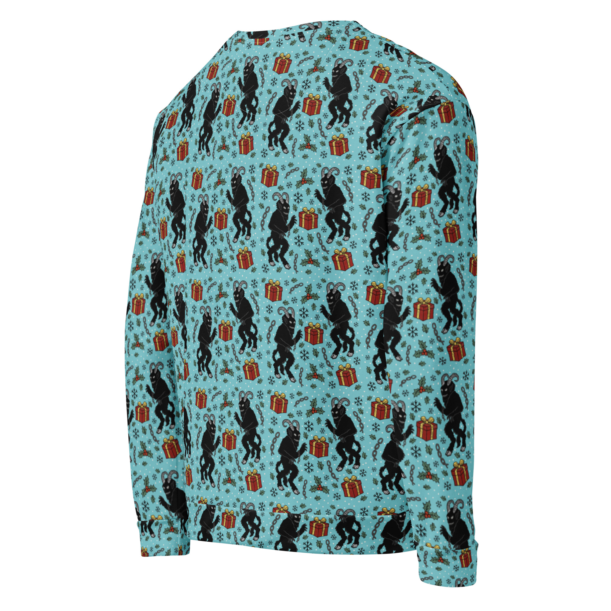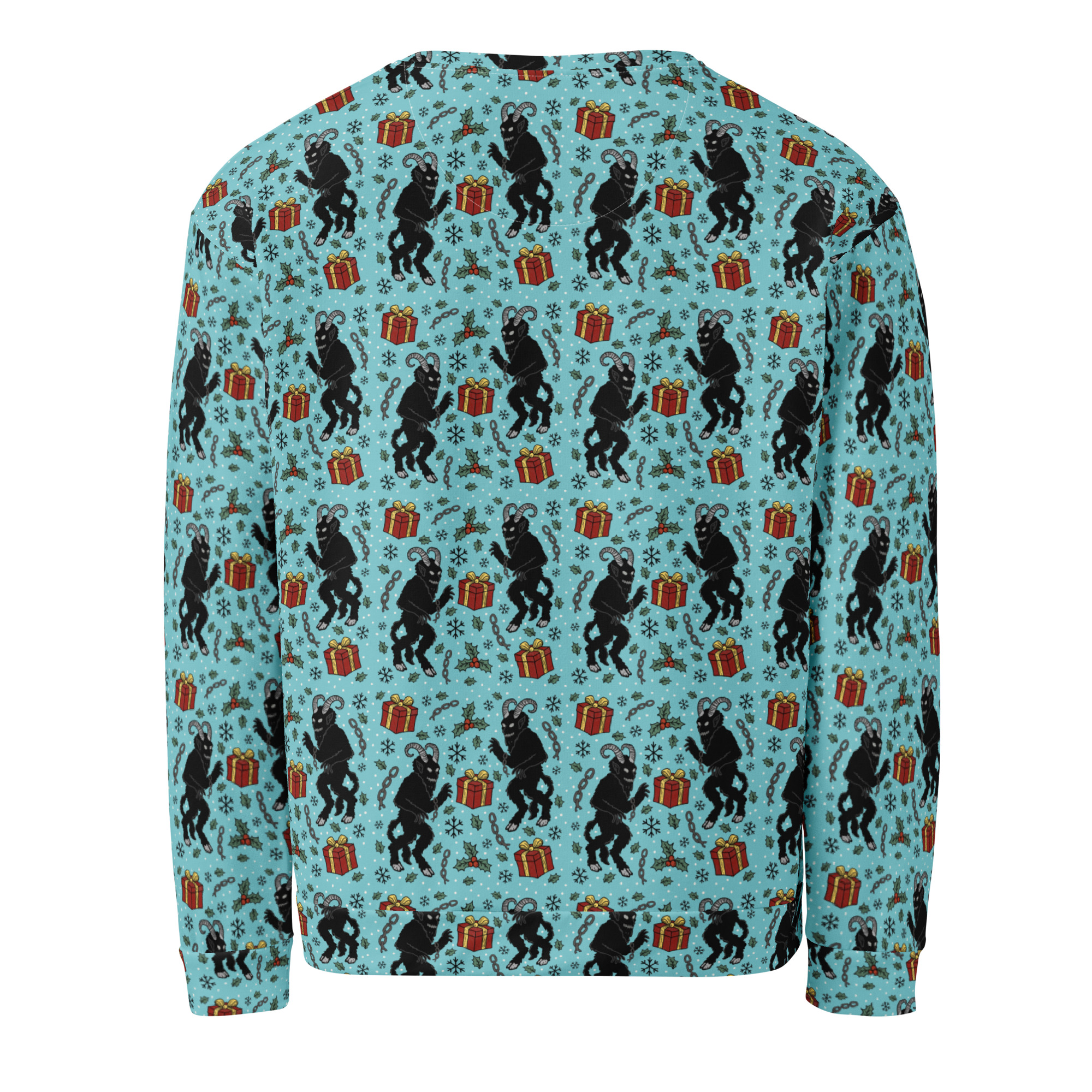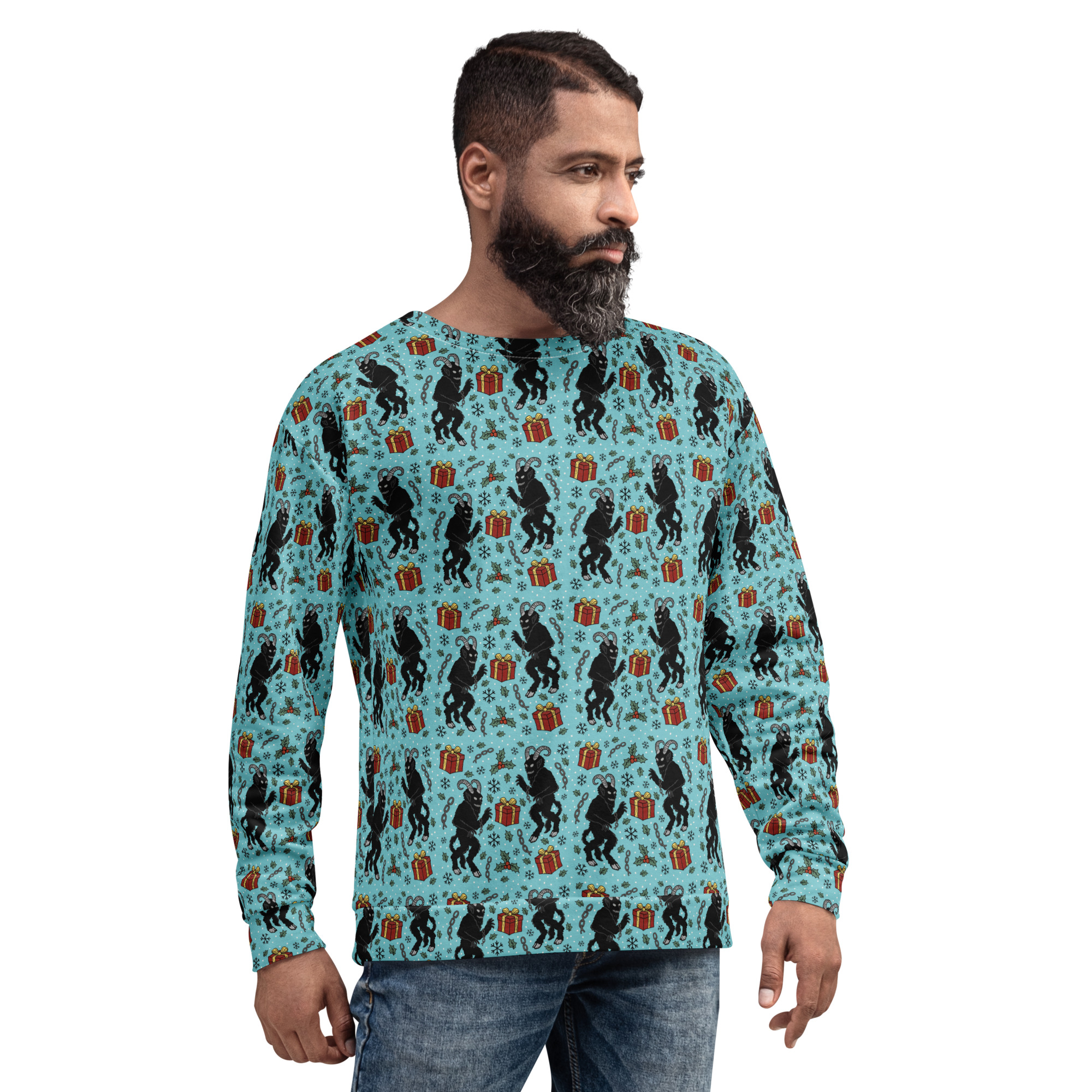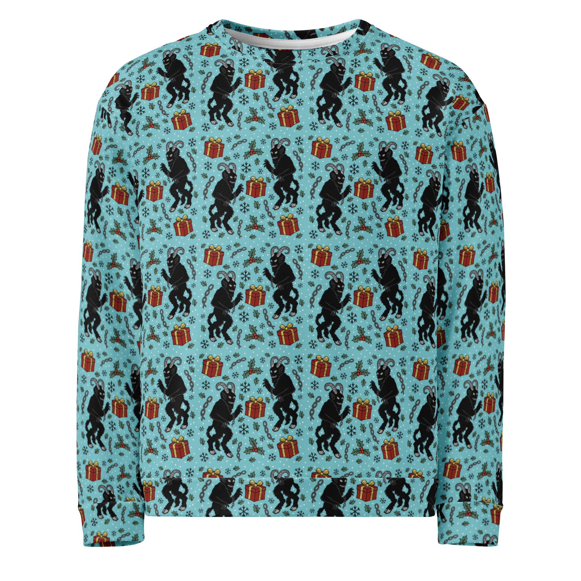 Varm och skön sweatshirt med mängder av söta julmotiv med Krampus och julklappar. Tillverkad i en superskön unisex-modell i blandad polyester, bomull och elastan. Tröjan har en mjuk bomullskänsla på utsidan och har varm och kammad fleece på insidan. Kommer garanterat bli din nya favorit på julen.