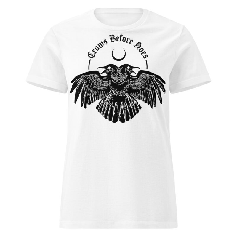 Semi-fitted t-shirt i vitt med två kråkor och texten ’Crows before hoes’ som dekoration på framsidan. Passar perfekt till kvinnor som älskar den alternativa stilen. Tröjan är tillverkad i en supermjuk kvalitet i 100% bomull.