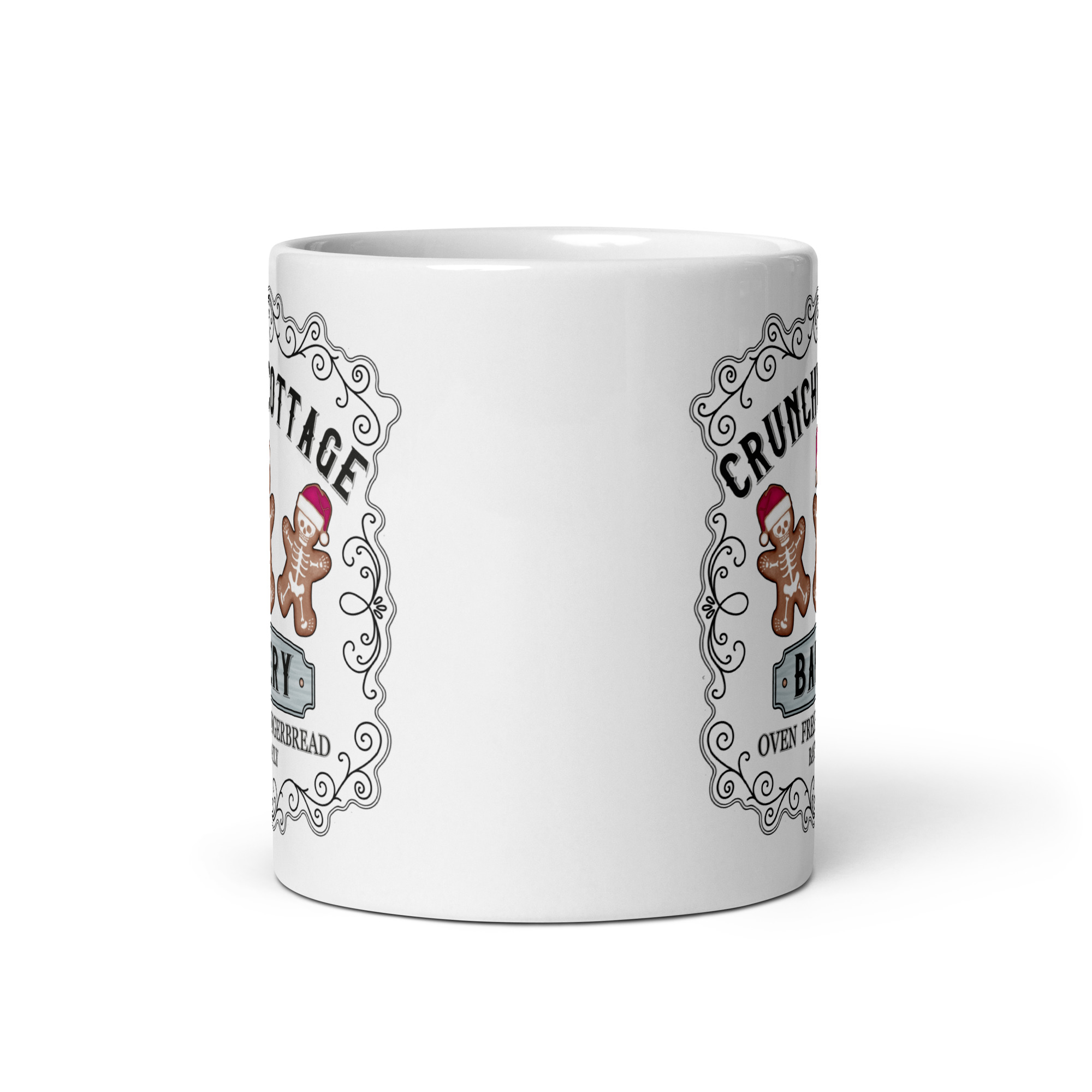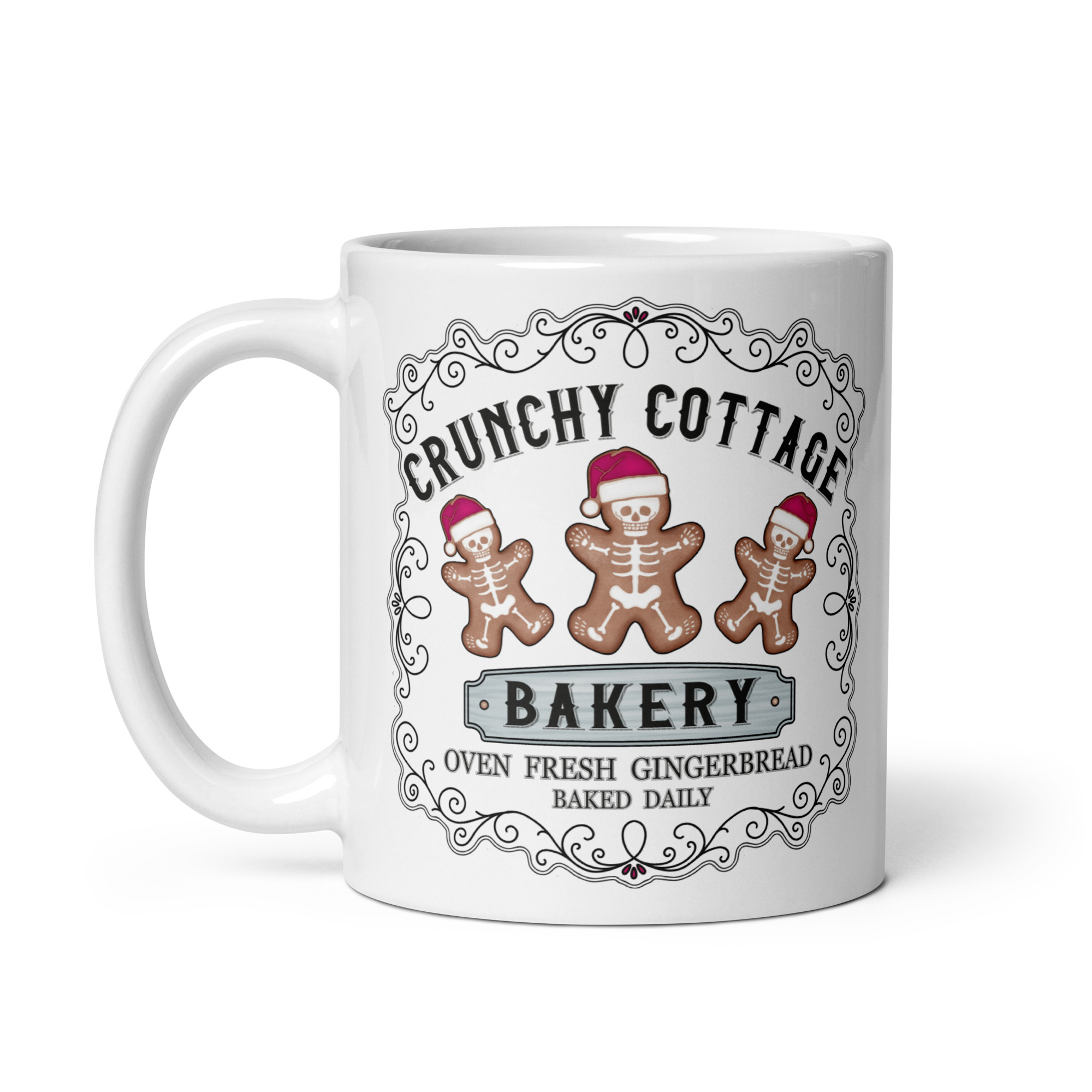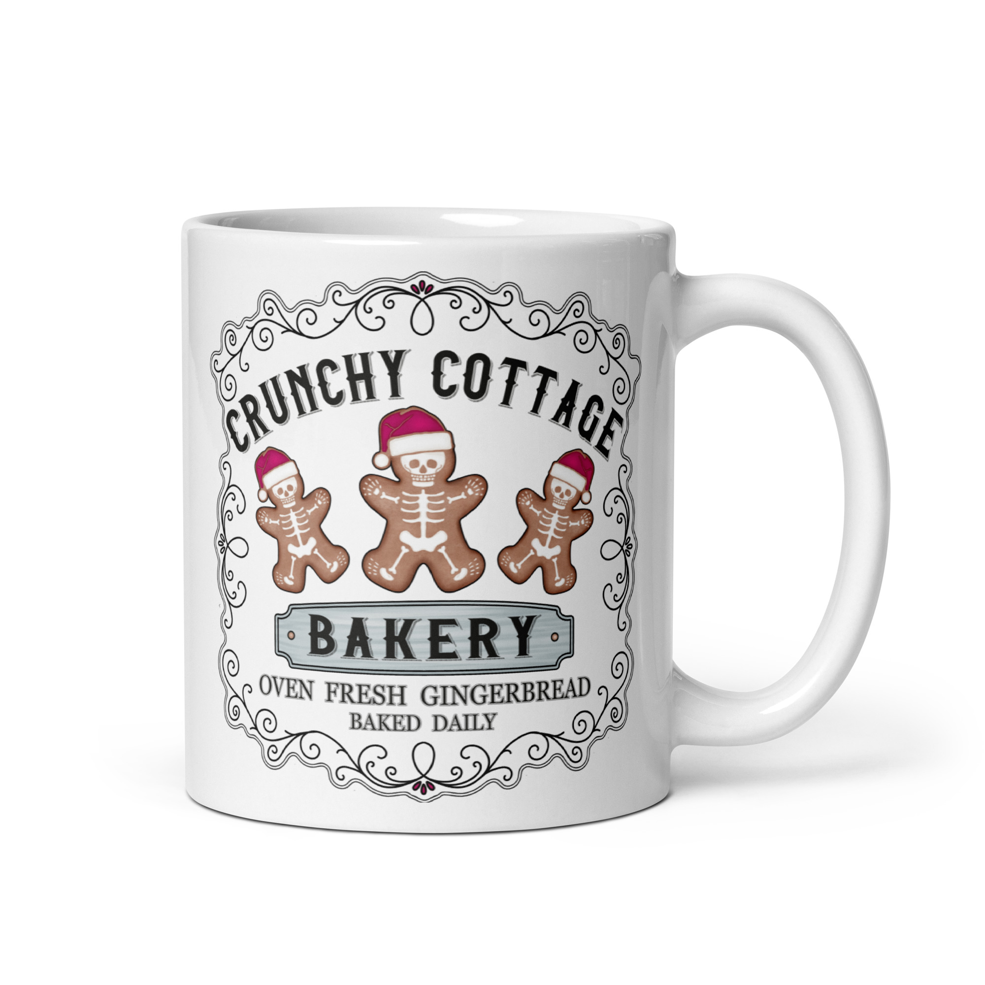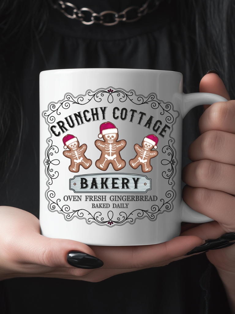 Mugg i vitt med tre pepparkakor med skelett och texten ’Crunchy cottage bakery’ som tryck på båda sidorna. Tillverkad i keramik med en höjd på 9,5 cm. Passar alla oss som älskar udda julprylar.