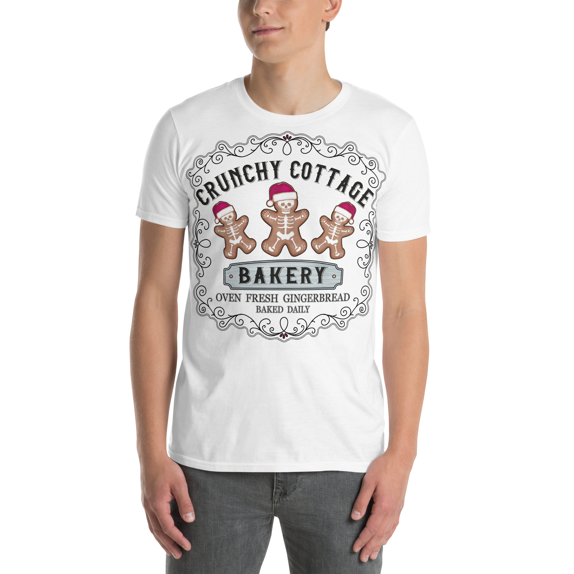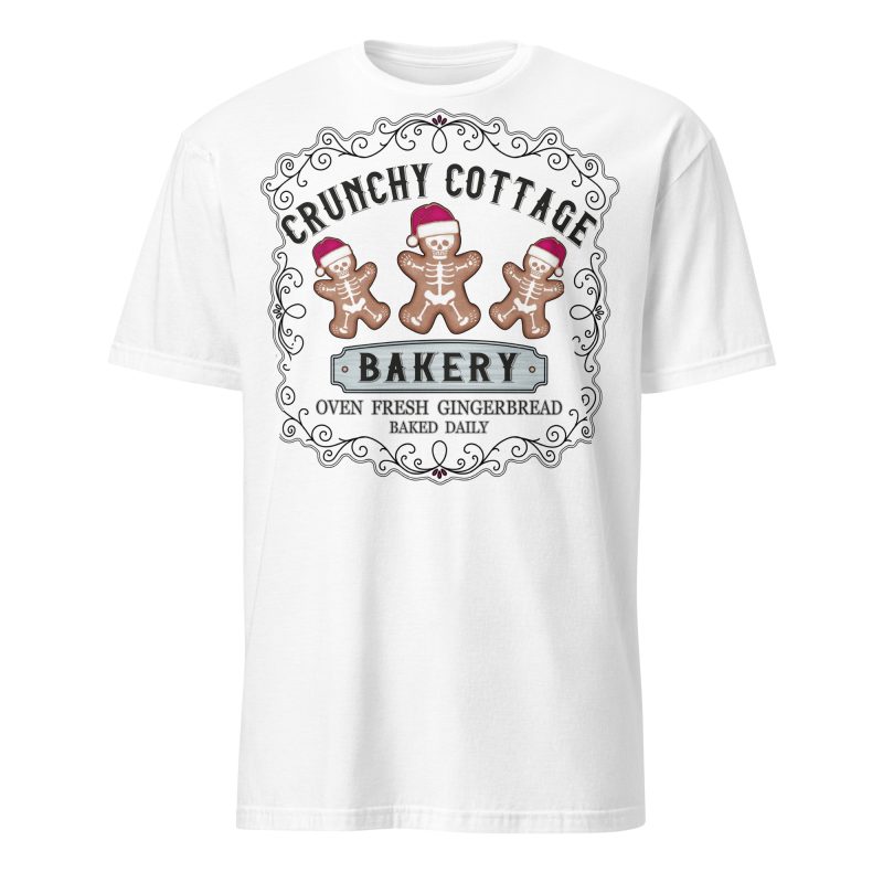 T-shirt i vitt med ett stort julmotiv med tre pepparkakor med skelett och texten ’Crunchy cottage bakery’ som dekoration på framsidan. Passar perfekt till kvinnor och män som älskar alternativa kläder. Tröjan är tillverkad i en supermjuk kvalitet i 100% bomull.