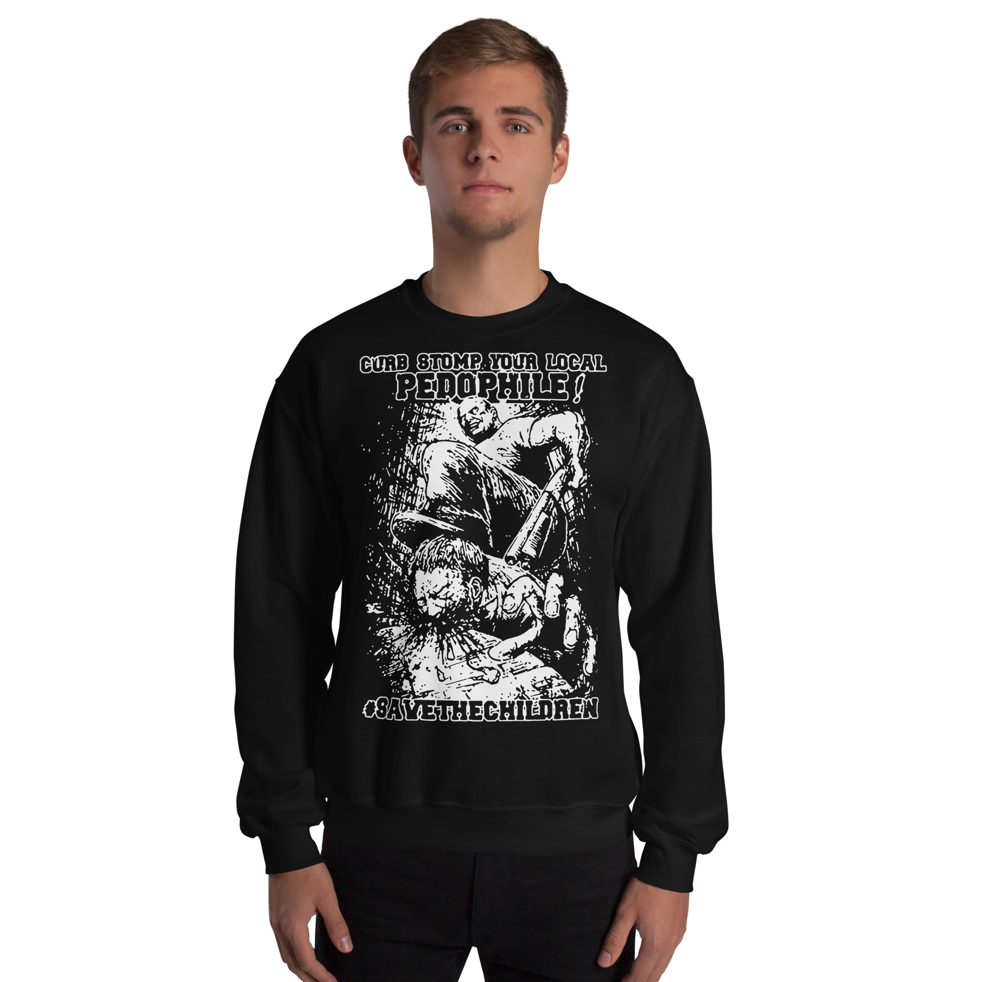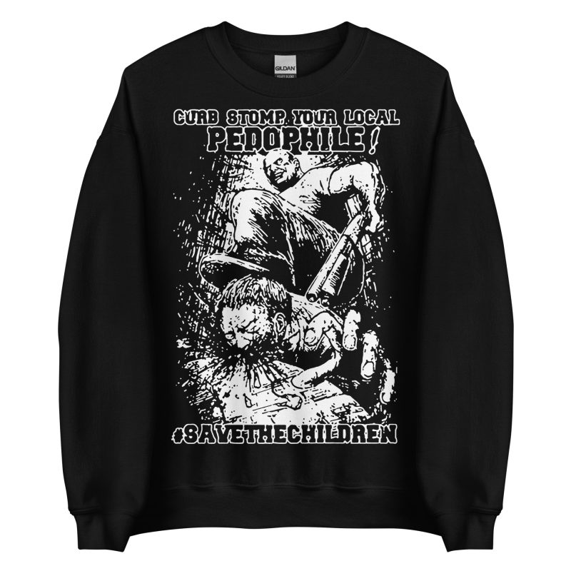 Varm och skön sweatshirt i svart tillverkad i blandad bomull/polyester med ett stort tryck med texten ’Curb stomp your local pedophile’ som dekoration på framsidan. Tröjan passar perfekt till både män och kvinnor som älskar den alternativa stilen.