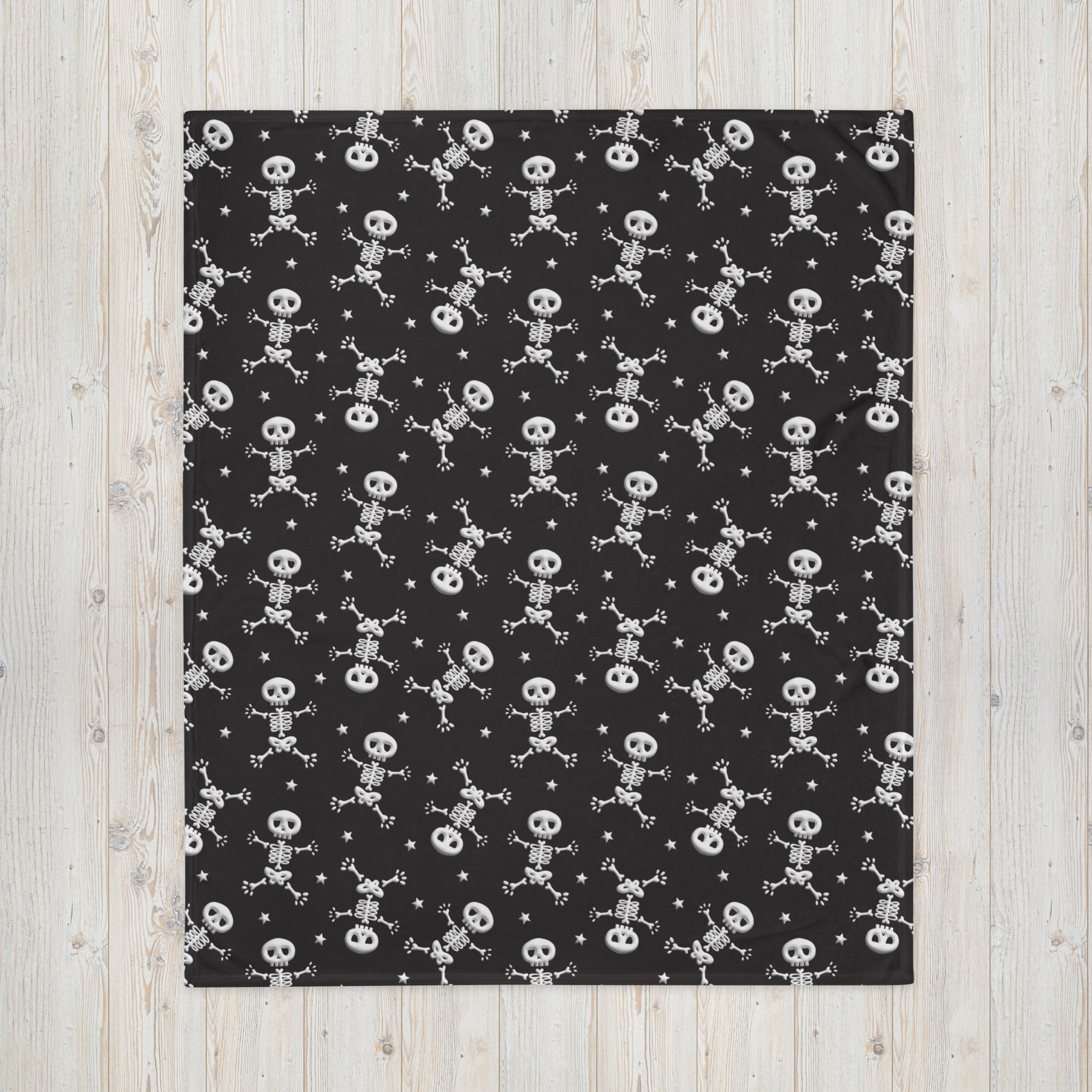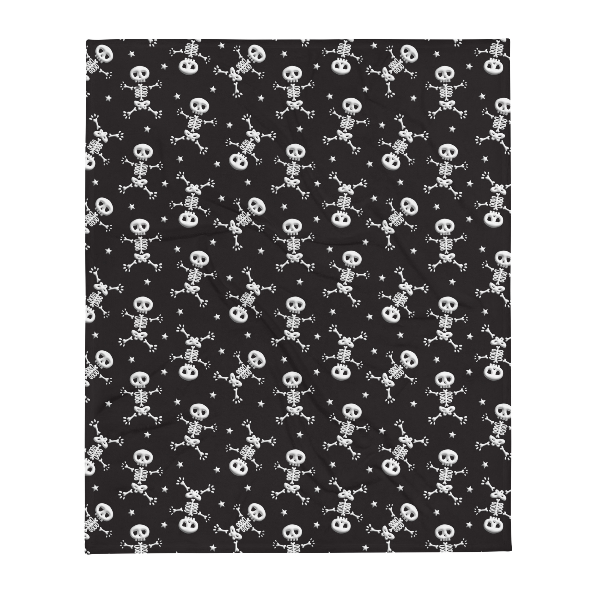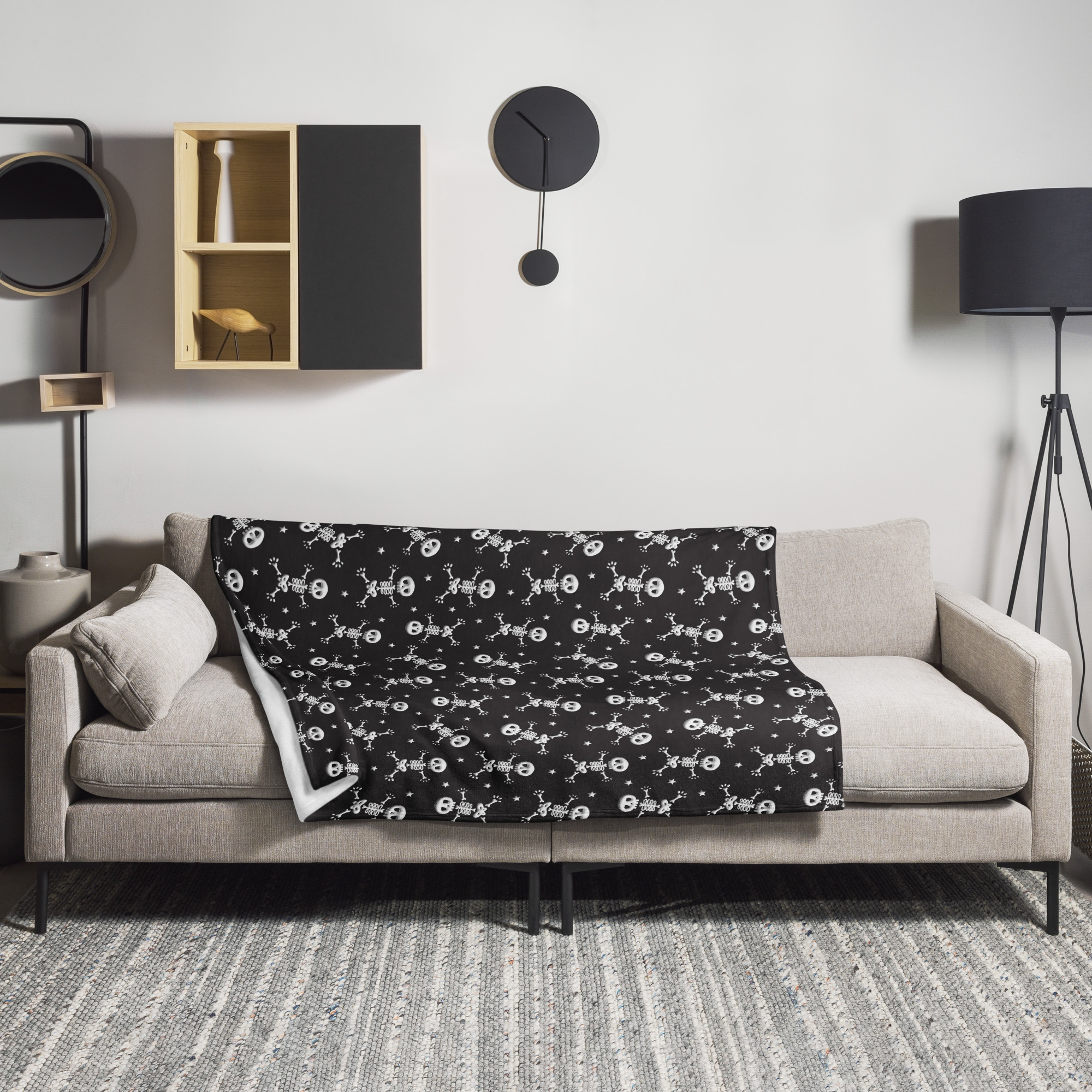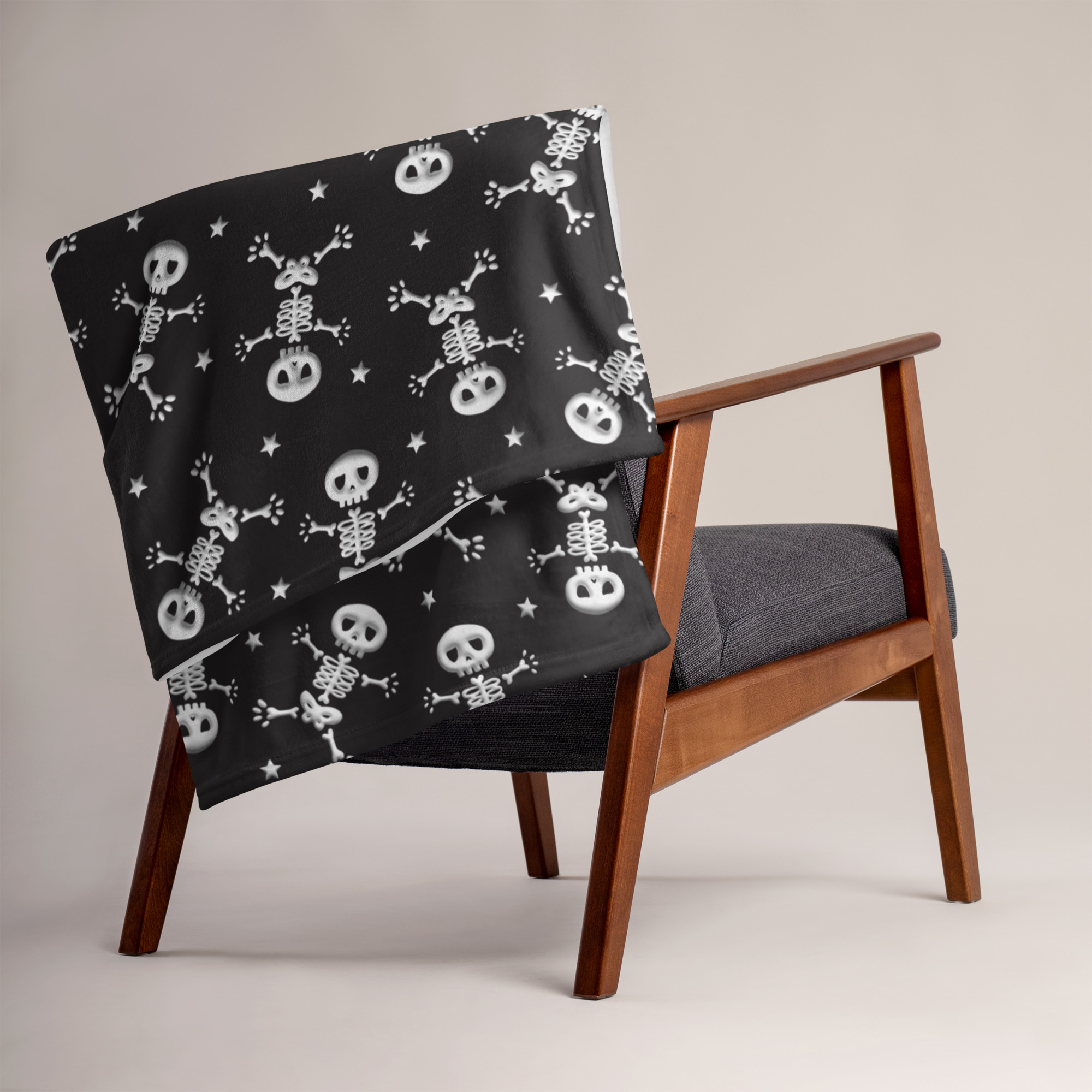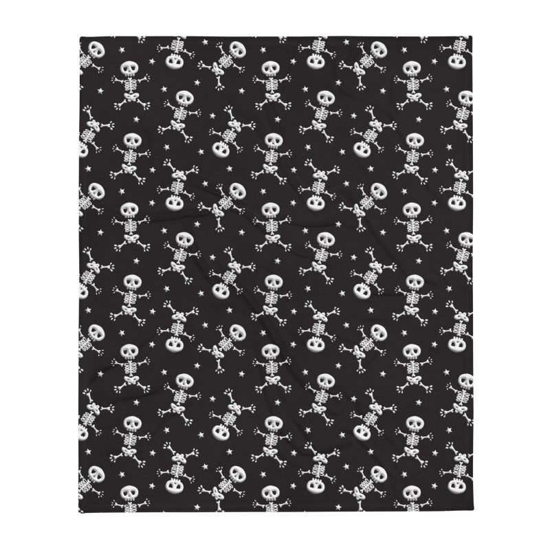 Snygg pläd med flera söta skelett som dekoration på ena sidan. Materialet är 100% polyester i en otroligt mjuk och fin kvalitet. Pläden är både allergivänlig och tillverkad i ett brandsäkert material. Storleken är 127×153 cm. Baksidan är lika mjuk och skön som framsidan i en vit färg.