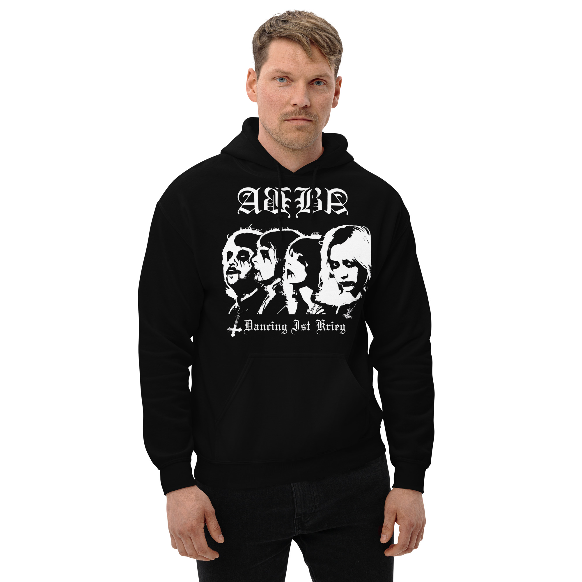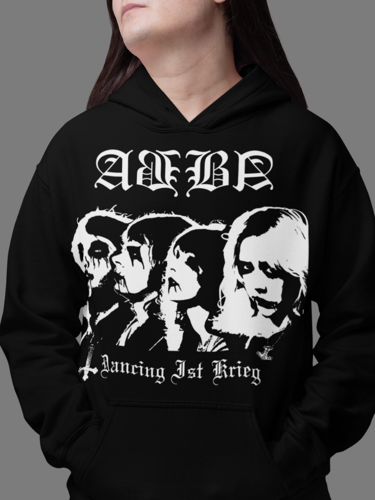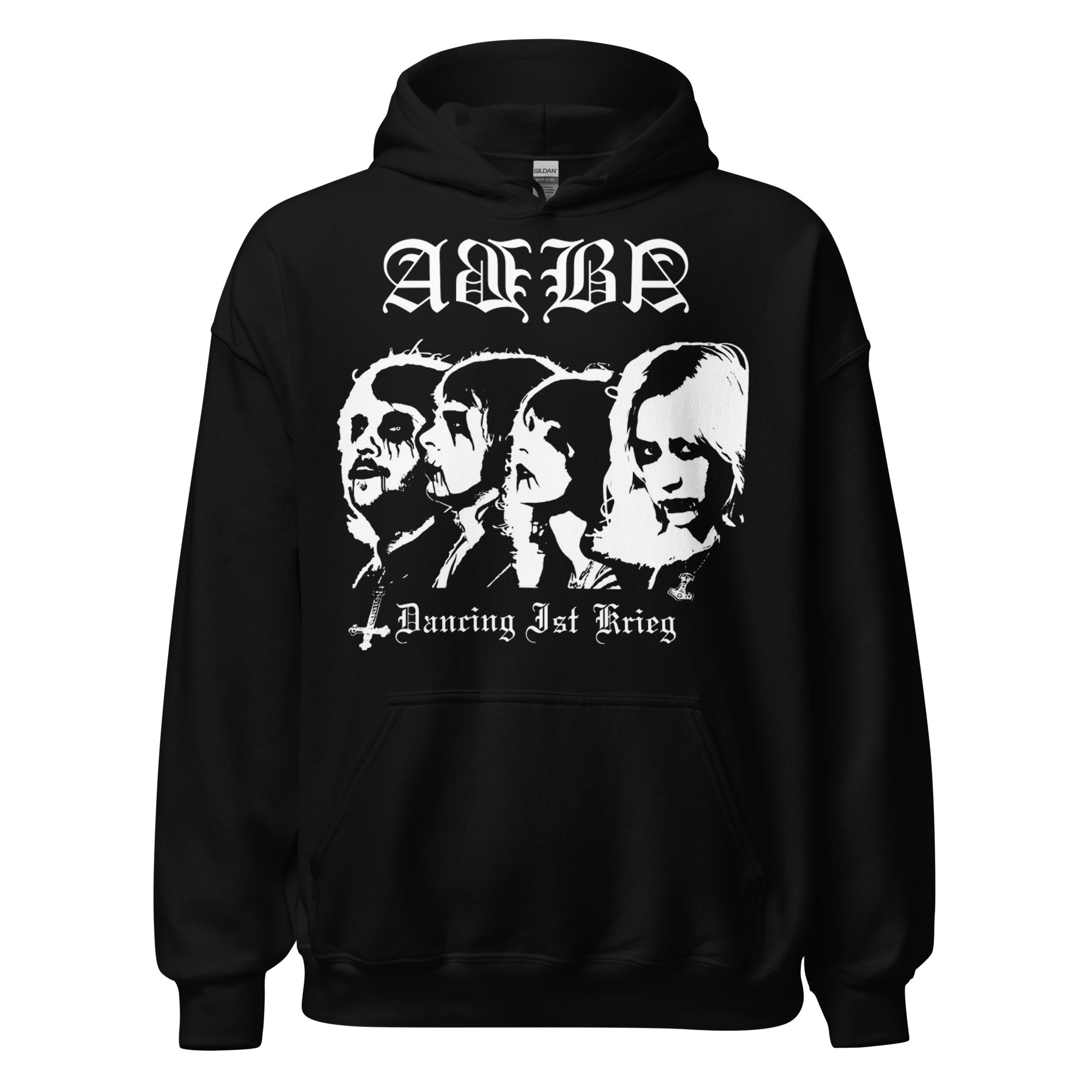 Hoodie i unisex-modell tillverkad i en fin kvalitet i blandad bomull och polyester. På framsidan återfinns en black metal-version av ABBA och texten ’Dancing ist krieg’ som dekoration. Hoodien håller värmen riktigt bra och har ett otroligt mjukt tyg.
