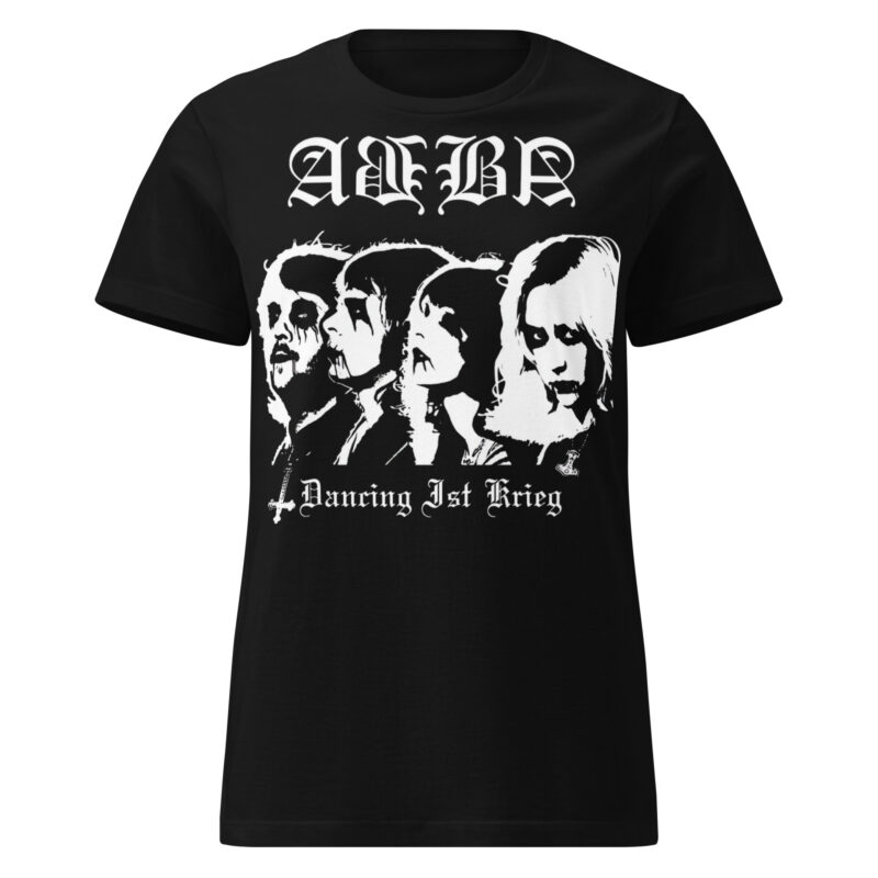 Semi-fitted t-shirt i svart med en black metal-version av ABBA och texten ’Dancing ist krieg’ som dekoration på framsidan. Passar perfekt till kvinnor som älskar alternativa kläder. Tröjan är tillverkad i en supermjuk kvalitet i 100% bomull.