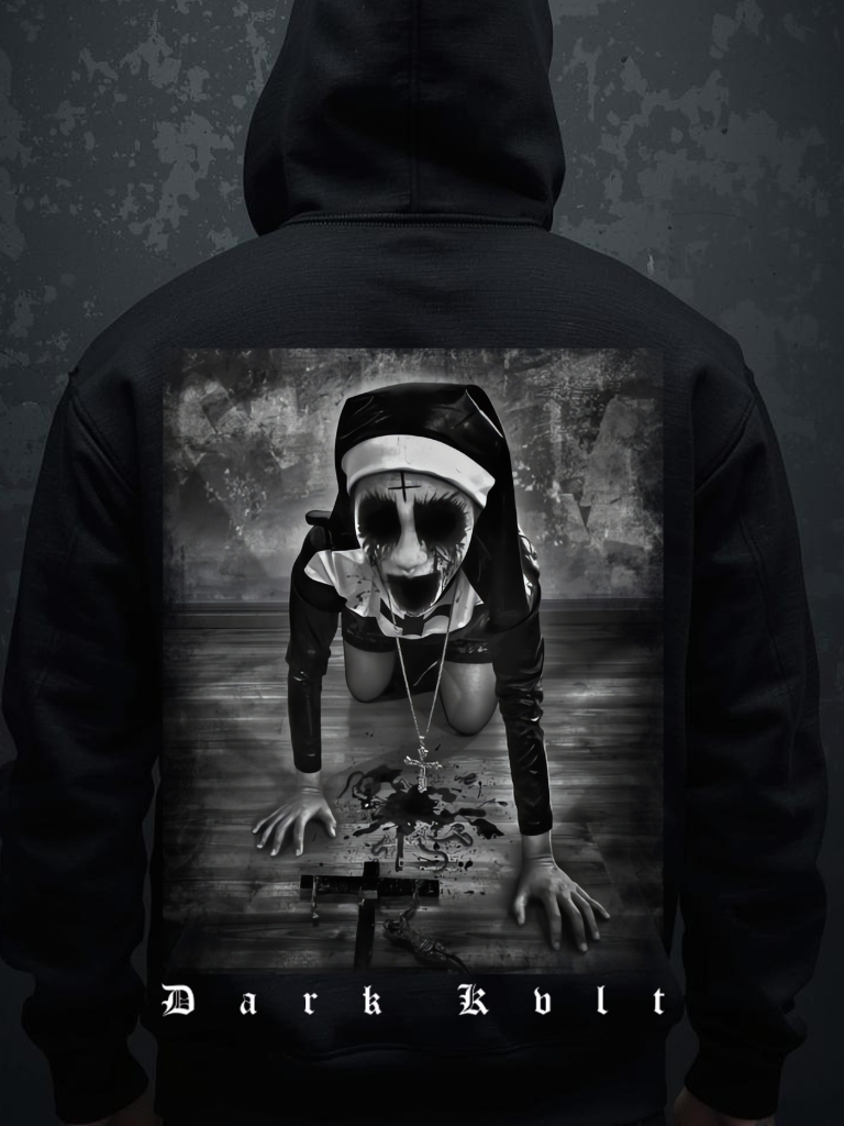 Snygg hoodie tillverkad i blandad bomull/polyester med ett detaljrikt tryck med en annorlunda nunna och texten ’Dark kult’ som dekoration på baksidan. Tröjan är i unisex-modell så den passar perfekt till både män och kvinnor.