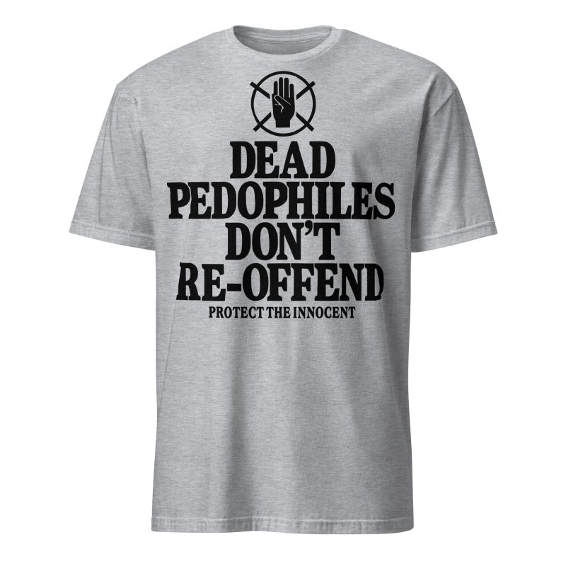 T-shirt i grått med ett stort tryck med texten ’Dead pedophiles don’t re-offend, protect the innocent’ som dekoration på framsidan. Passar perfekt till kvinnor och män som älskar den alternativa klädstilen. Tröjan är tillverkad i en supermjuk kvalitet i blandad bomull/polyester. Storleken är XXL.