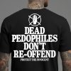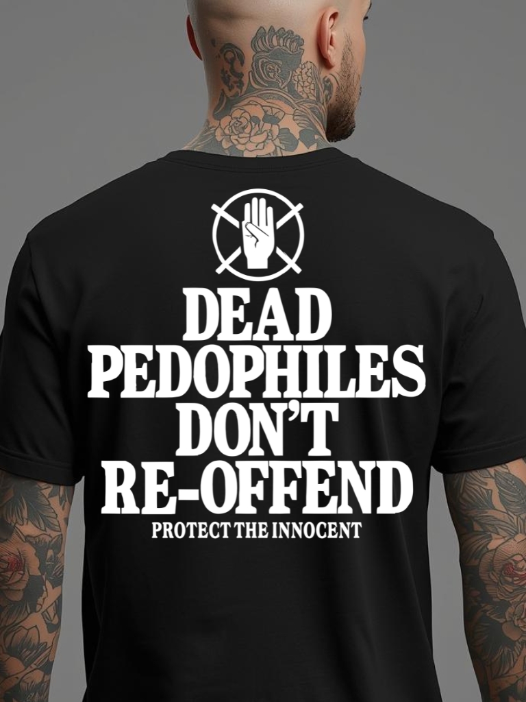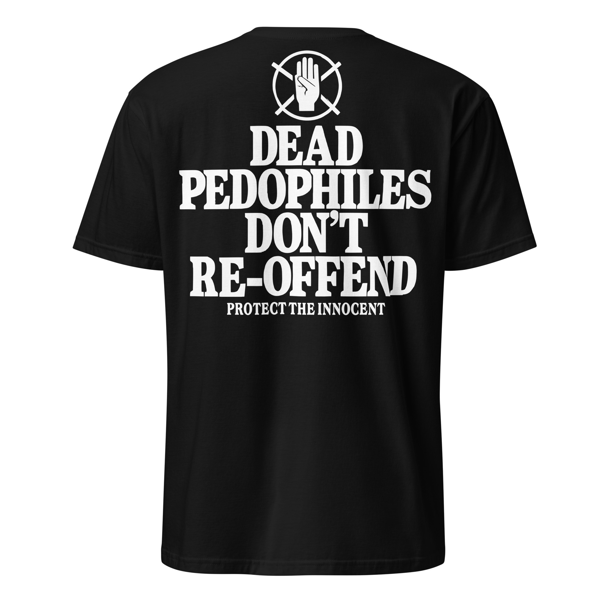 T-shirt i svart med ett stort tryck med texten ’Dead pedophiles don’t re-offend, protect the innocent’ som dekoration på ryggen. Passar perfekt till kvinnor och män som älskar den alternativa klädstilen. Tröjan är tillverkad i en supermjuk kvalitet i 100% bomull.
