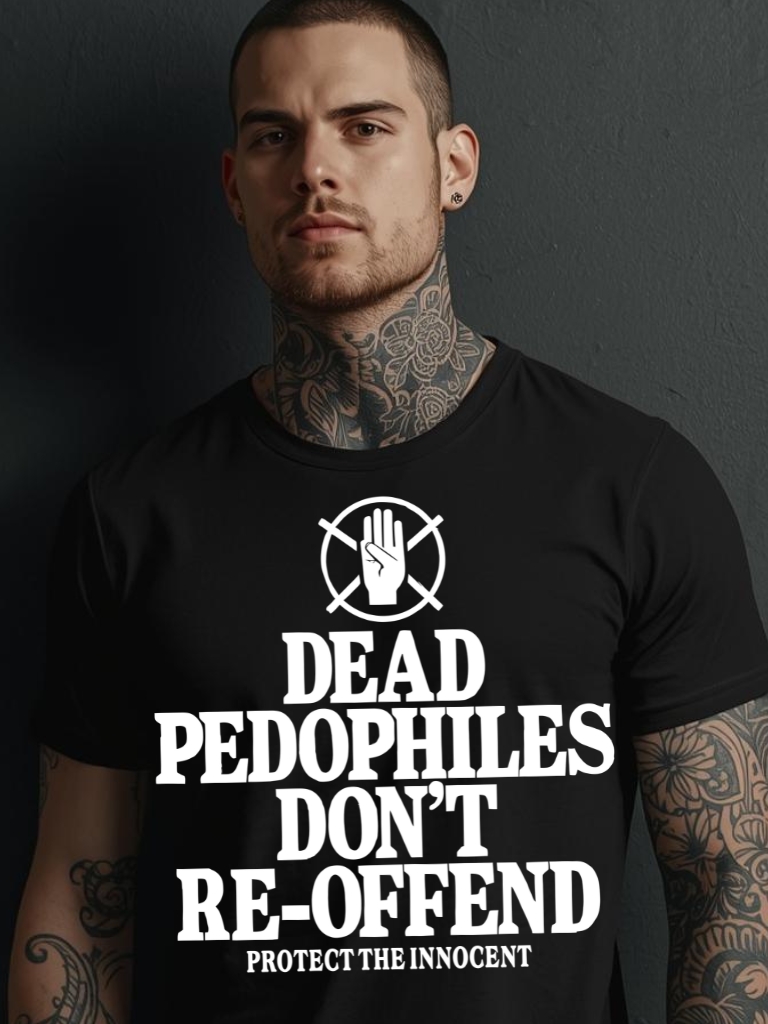 T-shirt i svart med ett stort tryck med texten ’Dead pedophiles don’t re-offend, protect the innocent’ som dekoration på framsidan. Passar perfekt till kvinnor och män som älskar den alternativa klädstilen. Tröjan är tillverkad i en supermjuk kvalitet i 100% bomull.