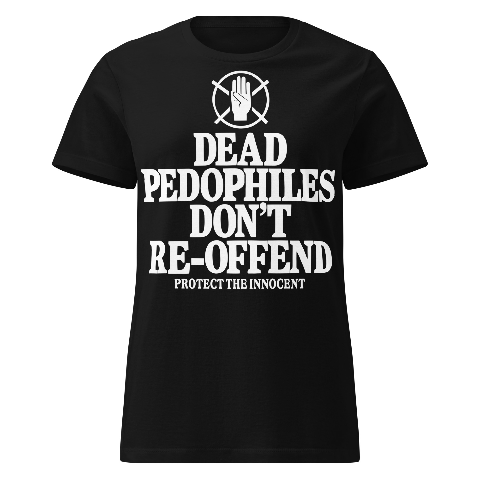Semi-fitted t-shirt i svart med ett stort tryck med texten ’Dead pedophiles don’t re-offend, protect the innocent’ som dekoration på framsidan. Passar perfekt till kvinnor som älskar den alternativa klädstilen. Tröjan är tillverkad i en supermjuk kvalitet i 100% bomull.