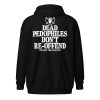Hoodie med dragkedja med ett stort ryggtryck och ett mindre tryck på ena bröstet. Trycket består av texten ’Dead pedophiles don’t re-offend’. Passar perfekt till både män och kvinnor, materialet är blandad bomull och polyester.