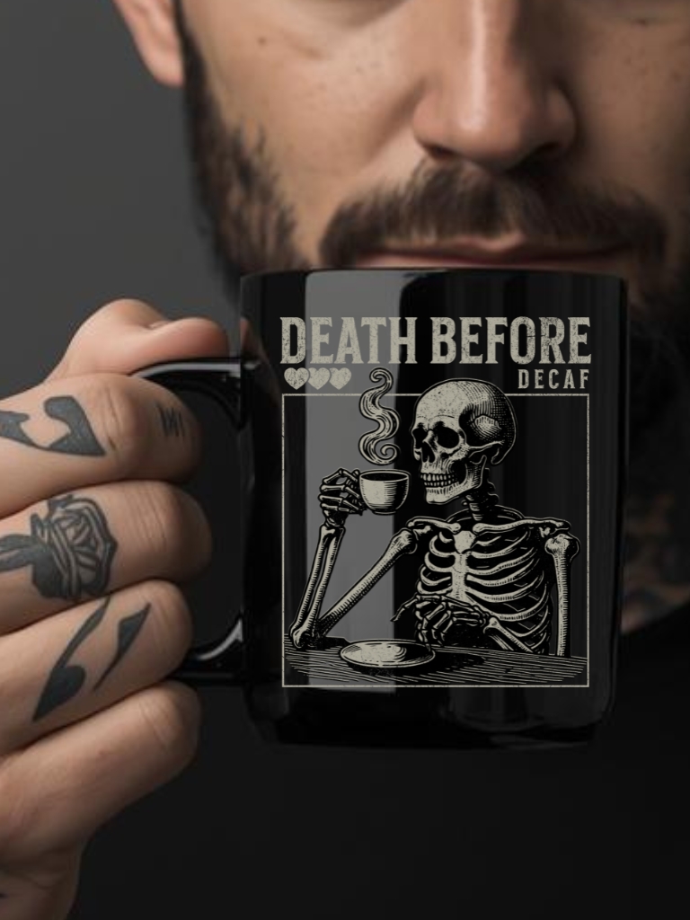 Mugg i svart med ett skelett som dricker kaffe och texten ’Death before decaf’ som motiv på båda sidorna. Muggen är tillverkad i svart glansig keramik.