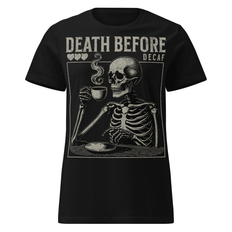 Semi-fitted t-shirt i svart med ett skelett som dricker kaffe och texten ’Death before decaf’ som dekoration på framsidan. Passar perfekt till kvinnor som älskar den alternativa stilen. Tröjan är tillverkad i en fin kvalitet i 100% bomull.