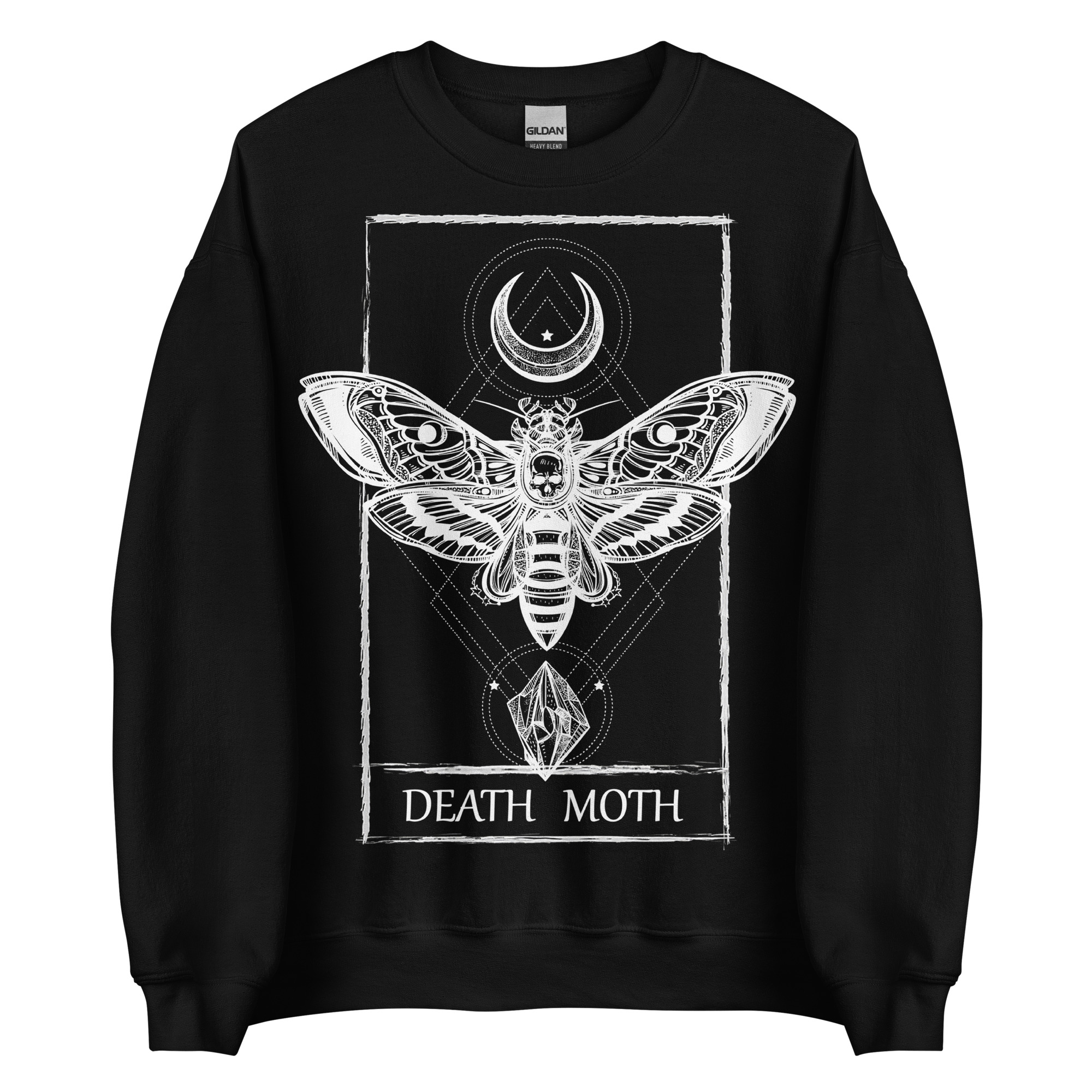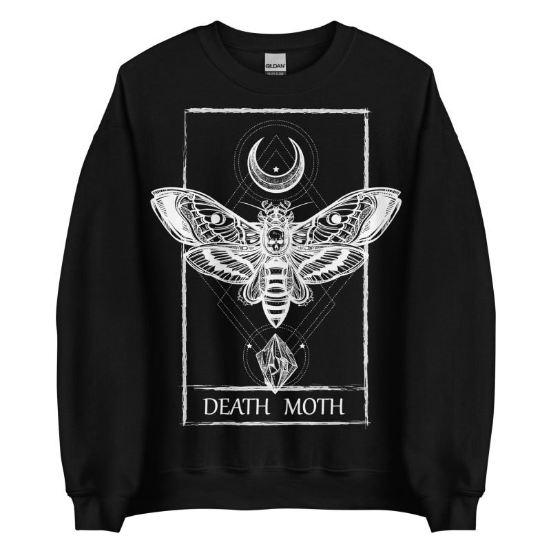 Varm och skön sweatshirt i svart tillverkad i blandad bomull/polyester med ett stort motiv med en dödskallemal och texten ’Death moth’ som dekoration på framsidan. Tröjan passar perfekt till både män och kvinnor som älskar alternativa kläder.