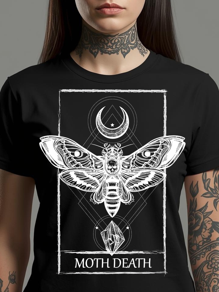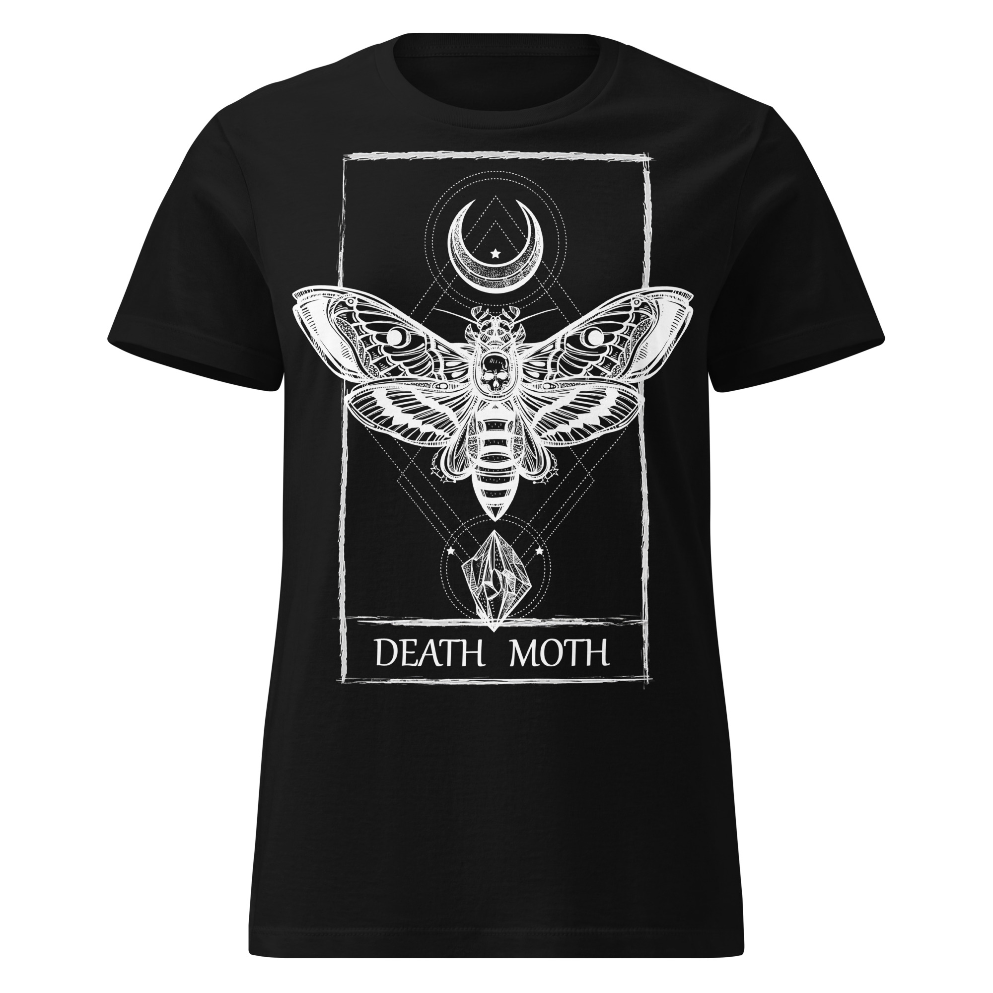 Semi-fitted t-shirt i svart med en stor dödskallemal och texten ’Death moth’ som dekoration på framsidan. Passar perfekt till kvinnor och är tillverkad i en supermjuk kvalitet i 100% bomull.