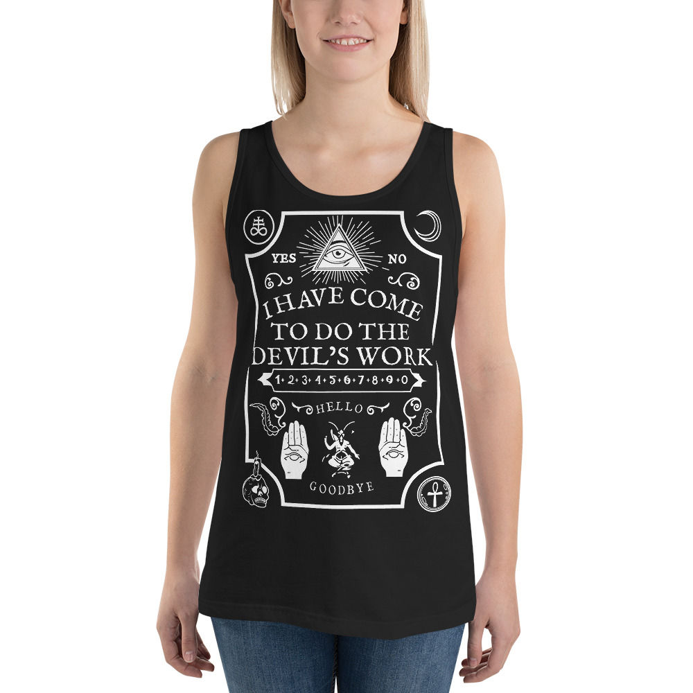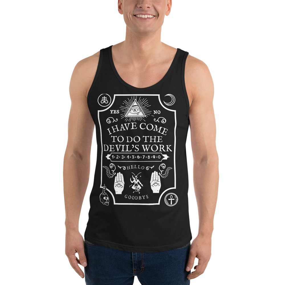 Linne i svart med ett satanistiskt ouija-motiv med texten ’I have come to do the devil’s work’ som tryck på framsidan. Tillverkad i en skön kvalitet i 100% bomull. Passar perfekt till både män och kvinnor.