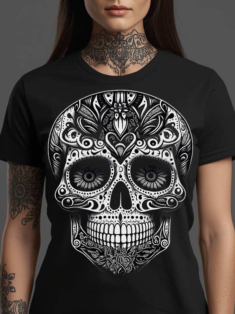 Semi-fitted t-shirt i svart med en stor detaljrik dödskalle som dekoration på framsidan. Passar perfekt till kvinnor som älskar den alternativa stilen. Tröjan är tillverkad i en fin kvalitet i 100% bomull.
