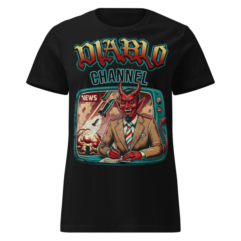 Semi-fitted t-shirt i svart med djävulen som har en tv-sändning på kanalen ’Diablo channel’ som dekoration på framsidan. Passar perfekt till kvinnor. Tröjan är tillverkad i en supermjuk kvalitet i 100% bomull.