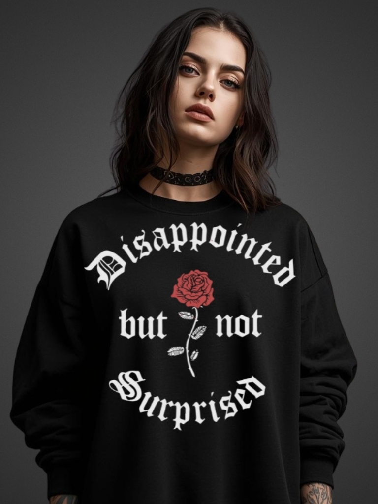 Varm och skön sweatshirt i svart tillverkad i blandad bomull/polyester med en ros och texten ’Disappointed, but not surprised’ som dekoration på framsidan. Unisex-modell som passar perfekt till både män och kvinnor som är besvikna, men inte förvånade.